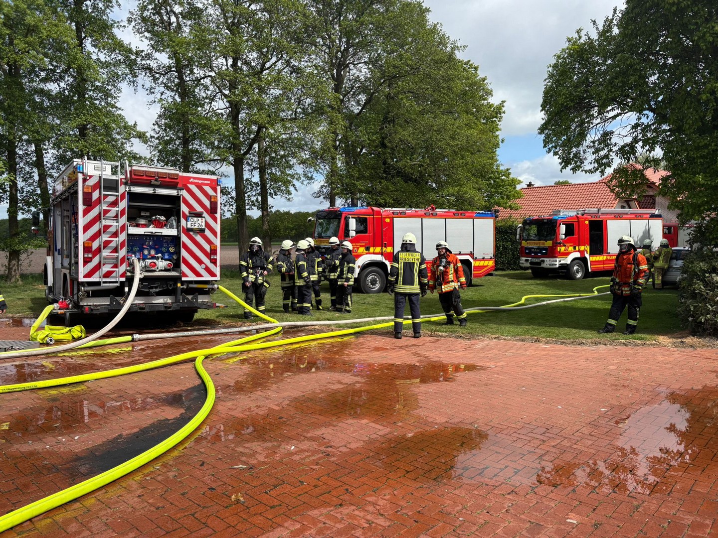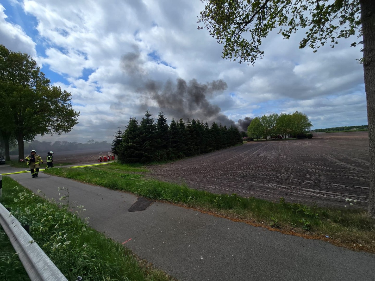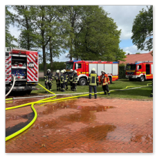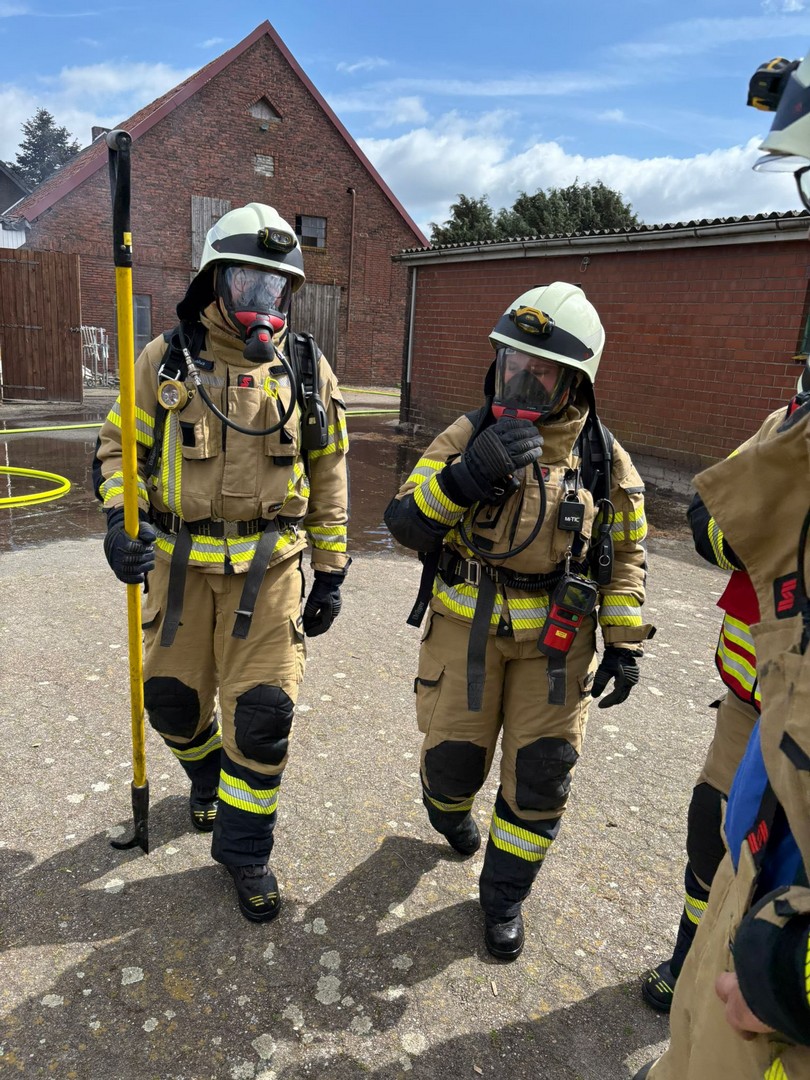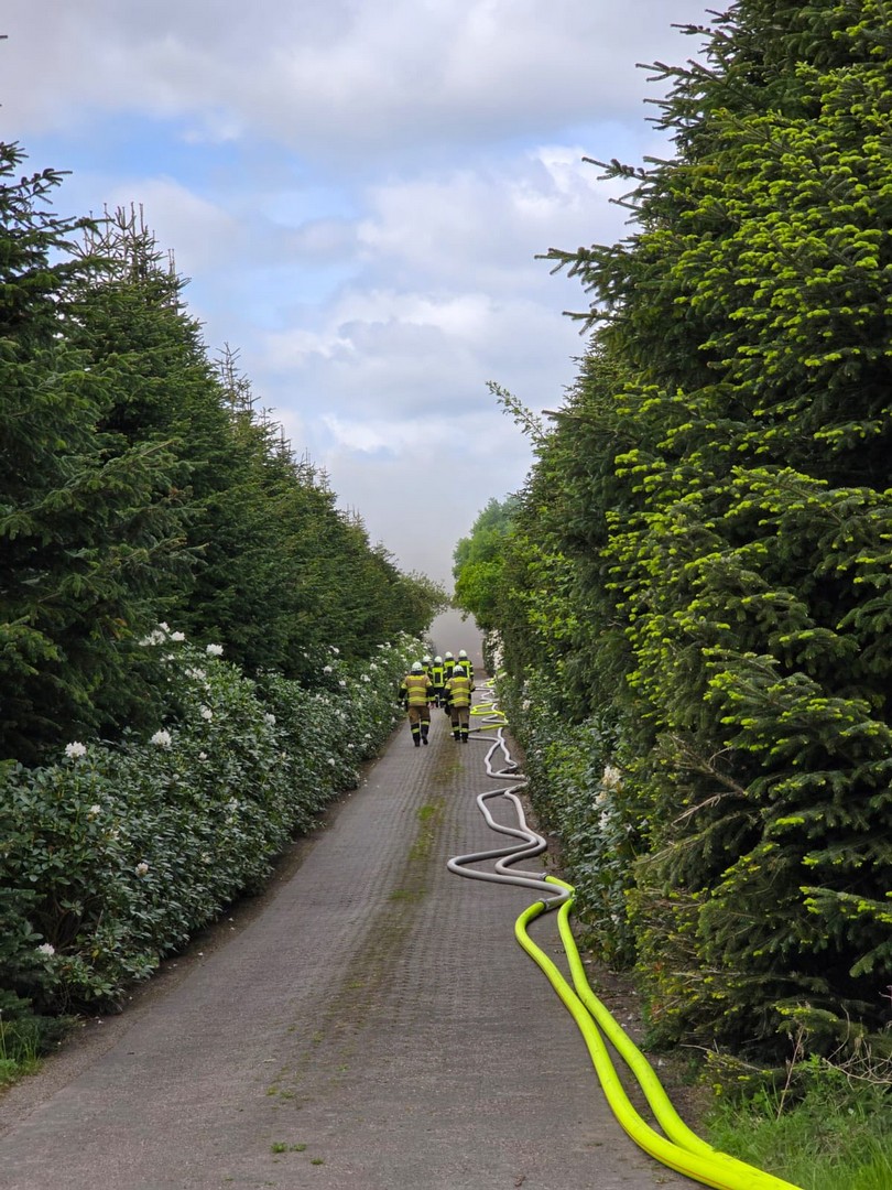 Schon auf der Anfahrt konnte man eine dichte Rauchwolke sehen, beim Eintreffen an der Einsatzstelle wurde umgehend mit der Brandbekämpfung unter Atemschutz begonnen. Kurz darauf trafen die Einsatzkräfte aus Friesoythe ein und bauten eine Wasserversorgung auf.