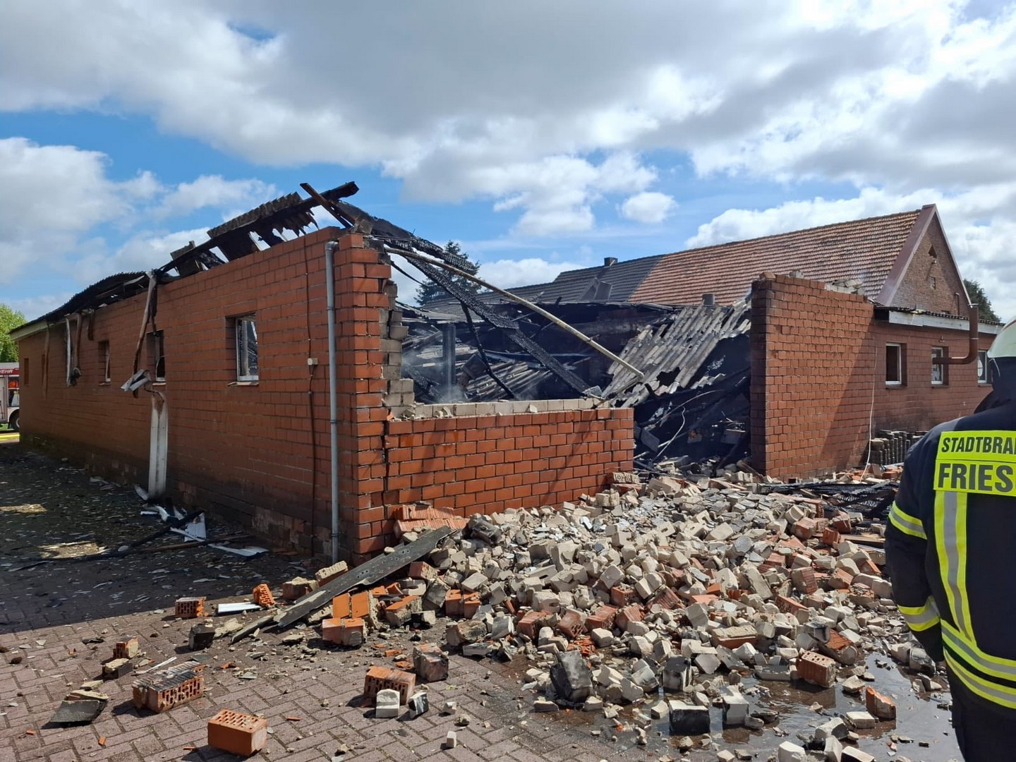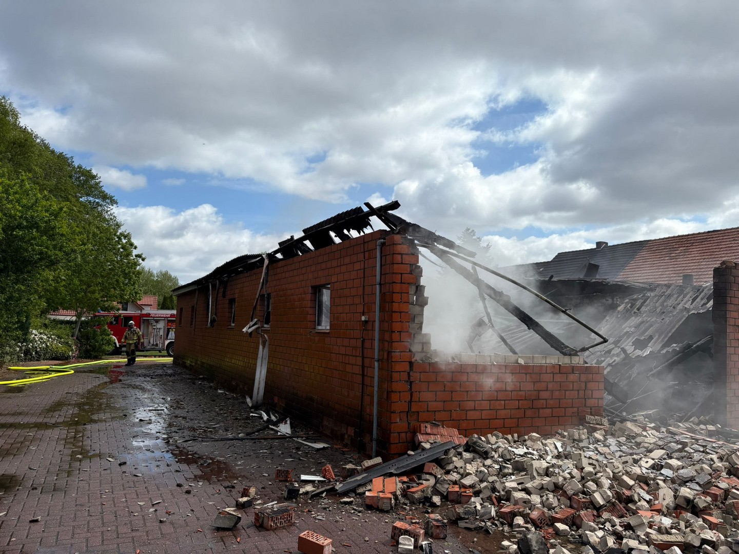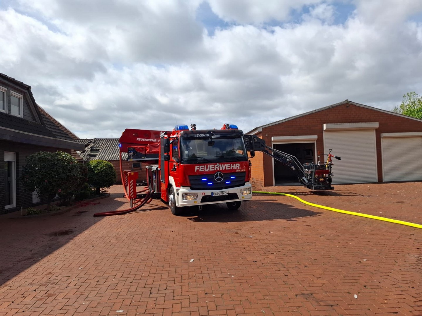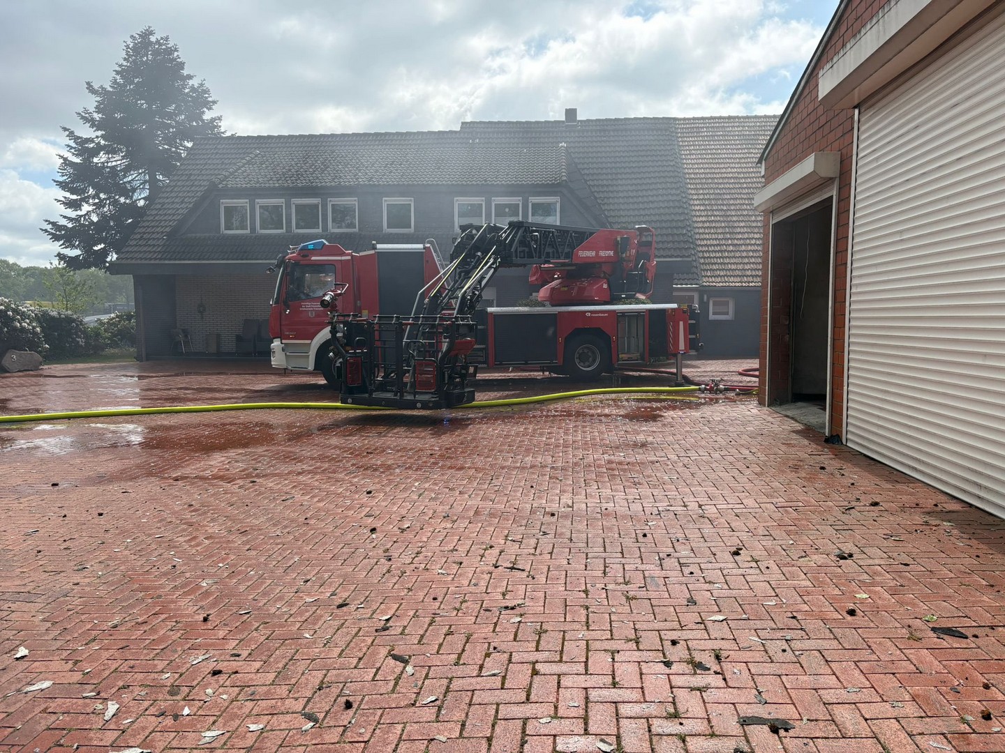 Schon auf der Anfahrt konnte man eine dichte Rauchwolke sehen, beim Eintreffen an der Einsatzstelle wurde umgehend mit der Brandbekämpfung unter Atemschutz begonnen. Kurz darauf trafen die Einsatzkräfte aus Friesoythe ein und bauten eine Wasserversorgung auf.