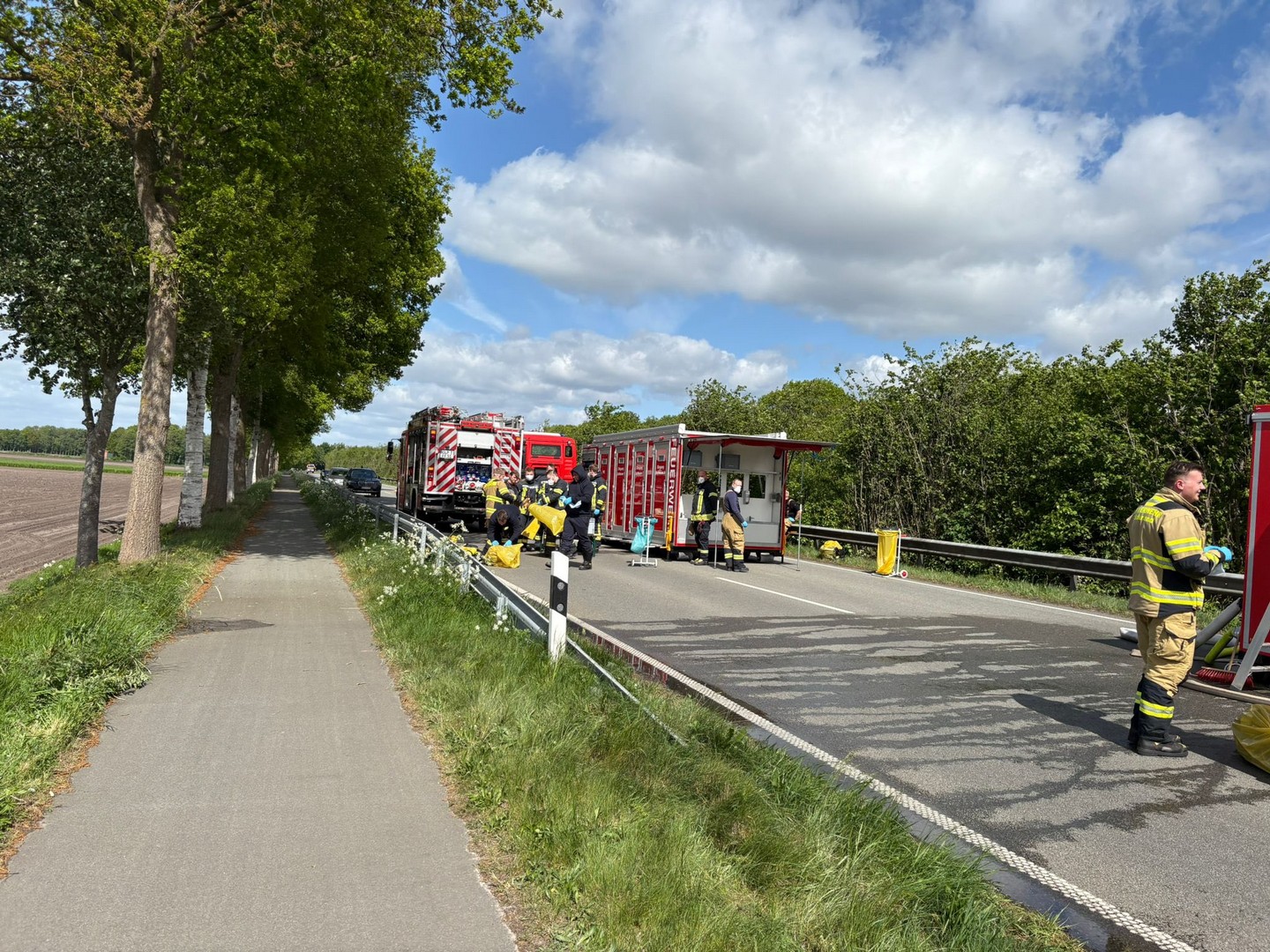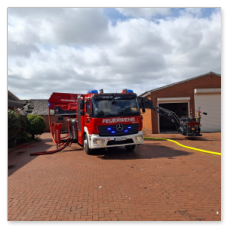 Parallel wurde der Wechsellader der FF Altenoythe auf der gesperrten Bundesstraße 401 in Stellung gebracht. Über den AB-Wasser konnte Löschwasser direkt aus dem Küstenkanal zur Einsatzstelle gepumpt werden. Nach dem Einsatz erfolgte die Einsatzstellenhygiene direkt vor Ort: Die im Innenangriff eingesetzten Atemschutzgeräteträger legten im neu angeschafften und in Molbergen stationierten AB-Hygiene ihre kontaminierte Kleidung ab, konnten dort duschen und traten die Rückfahrt in frischer Kleidung (Jogginganzug) an. Diese besondere Maßnahme dient dem Schutz von Personal und Gerät – insbesondere vor gefährlichen Rückständen aus dem Brandrauch. Die kontaminierte Einsatzkleidung wird im Anschluss des Einsatzes fachgerecht gereinigt.