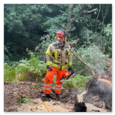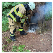 Mit der Kettensäge ging es an die Arbeit, nach wenigen Minuten lag der Baum und konnte vollständig abgelöscht werden.