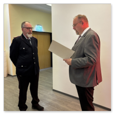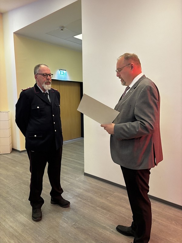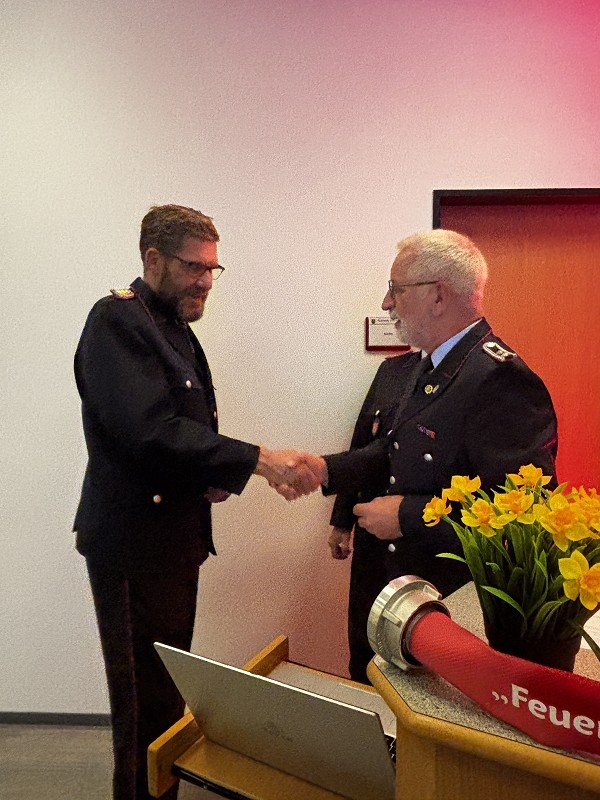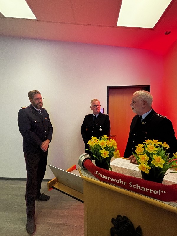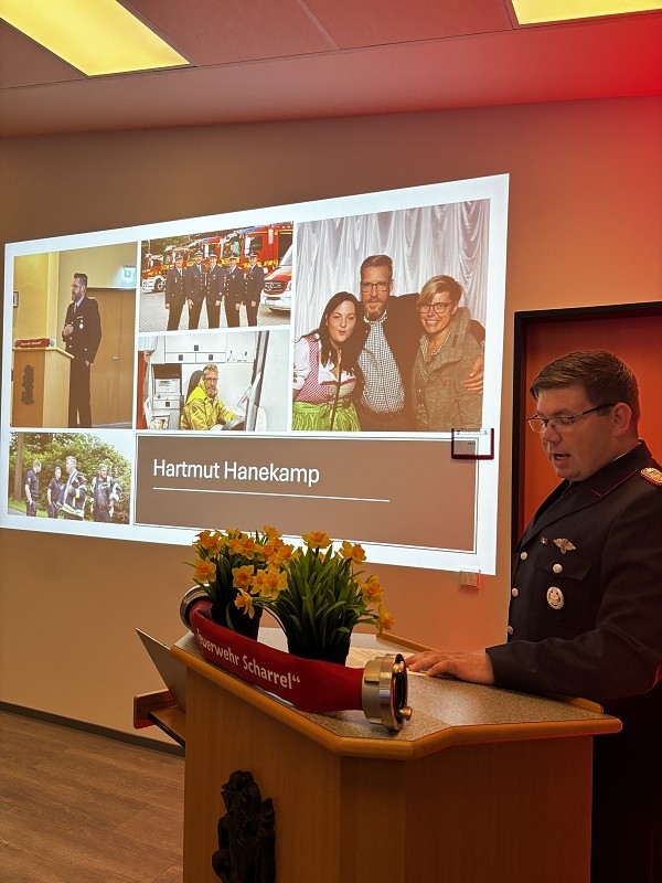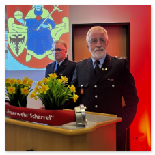 Dieter Janßen war seit Anfang der 1980er-Jahre aktiv und absolvierte zahlreiche Lehrgänge bis hin zum Zugführer. Viele Jahre war er in Scharrel als Führungskraft tätig, sein Dienstgrad ist Brandmeister und war zuletzt als Zugführer in der FF Scharrel tätig. Besonders seine Arbeit im First-Responder-Team und sein Fachwissen im Bereich Technik prägten die Wehr. Auch seine beiden Söhne traten in seine Fußstapfen.Hartmut Hanekamp trat 1990 in die Feuerwehr ein und durchlief eine beeindruckende Laufbahn: vom Feuerwehrmann bis zum Oberbrandmeister, stellvertretender Ortsbrandmeister, später stellvertretender und schließlich Gemeindebrandmeister. Auch auf Kreisebene engagierte er sich bei den Funkern sowie in der Jugendfeuerwehrküche. Besonders in Erinnerung bleibt seine Rolle beim Wiederaufbau nach dem großen Brand in Scharrel. Aus gesundheitlichen Gründen musste er den aktiven Dienst nun beenden. Ortsbrandmeister Lukas von Kajdacsy und sein Stellvertreter Matthias Pörschke überreichten beiden Kameraden ein Präsent.