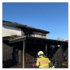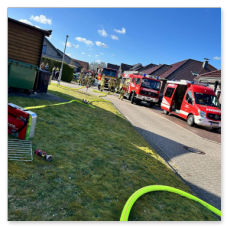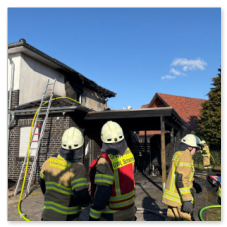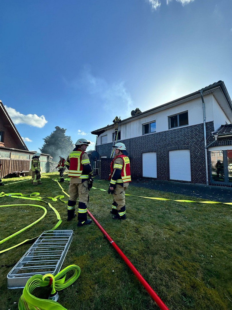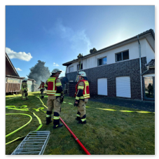 Unter Atemschutz ging es direkt an die Brandbekämpfung, während weitere Einsatzkräfte die Wasserversorgung sicherstellten. Da sich das Feuer bis auf das Dach des Wohnhauses ausgebreitet hatte, musste über Steckleitern vorgegangen werden, um auch dort den Brand zu löschen.