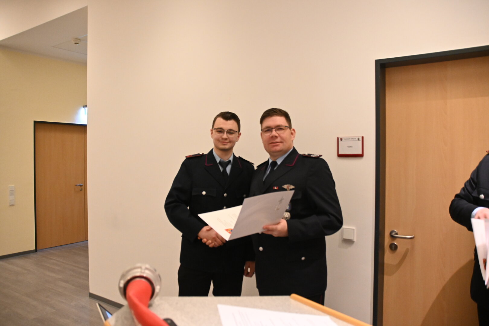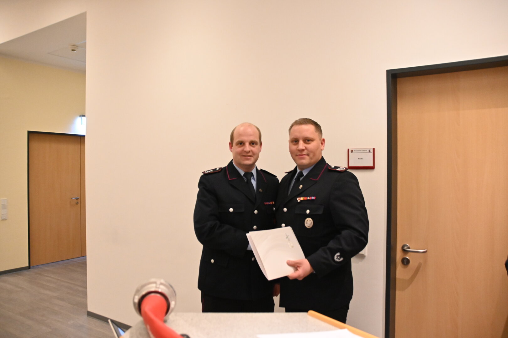 Gemeindebrandmeister Matthias Pörschke beförderte Christian Kuhl zum 1. Hauptbrandmeister.