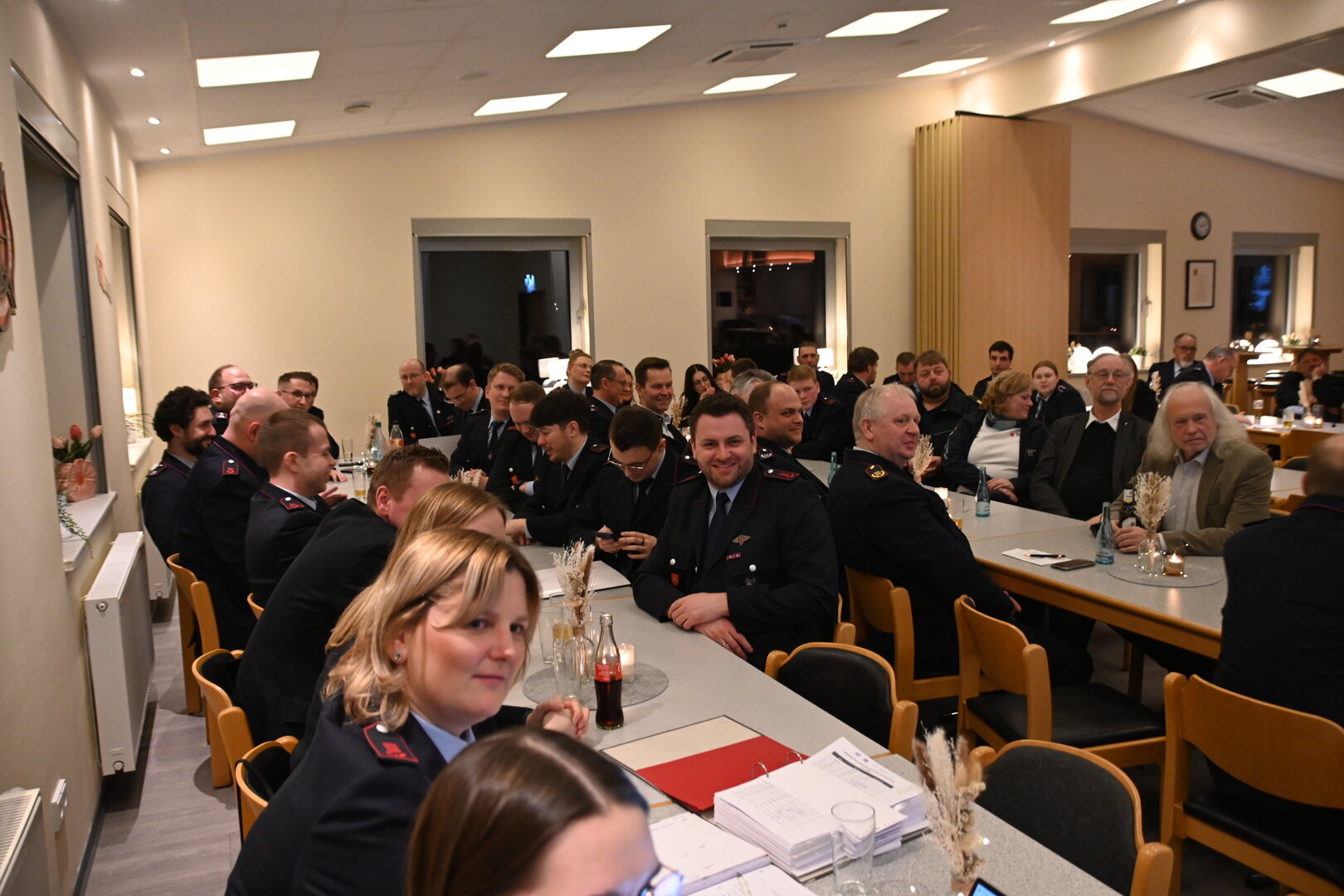 Unter den Anwesenden waren unter anderem Bürgermeister Thomas Otto, Ordnungsamtsleiter Christof Naber, der stellvertretende Kreisbrandmeister Franz Josef Nording als Vertreter des Kreisfeuerwehrverband Cloppenburg, Gemeindebrandmeister Matthias Pörschke mit seinem Stellvertreter Kevin Heese, Ortsbrandmeister Matthias Schulte von der Feuerwehr Ramsloh mit seinem Stellvertreter Timo Hinrichs, Gemeindepressewart Thomas Giehl, der Vorsitzende des Feuerwehrfachausschusses Georg Tebben, Pfarrer Ludger Fischer sowie Andreas Thoben von der Öffentlichen Versicherung. Ebenso begrüßt wurden die Kameraden der Alters- und Ehrenabteilung sowie alle aktiven Mitglieder. Besonders hervorgehoben wurde Greta Kawaletz als „Jugendfeuerwehrfrau des Jahres 2025“.