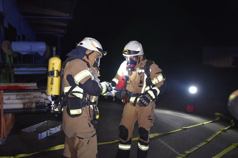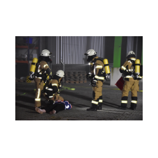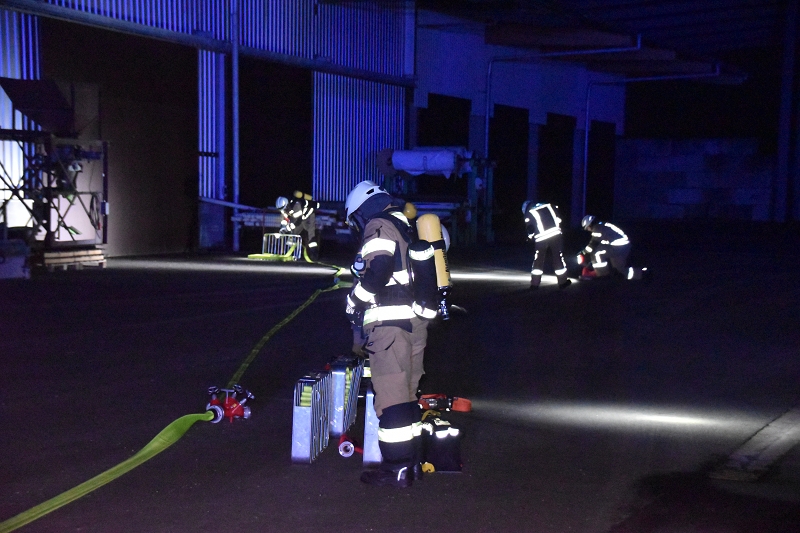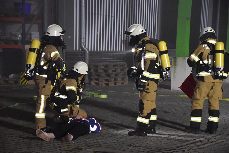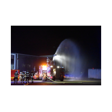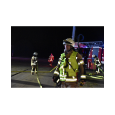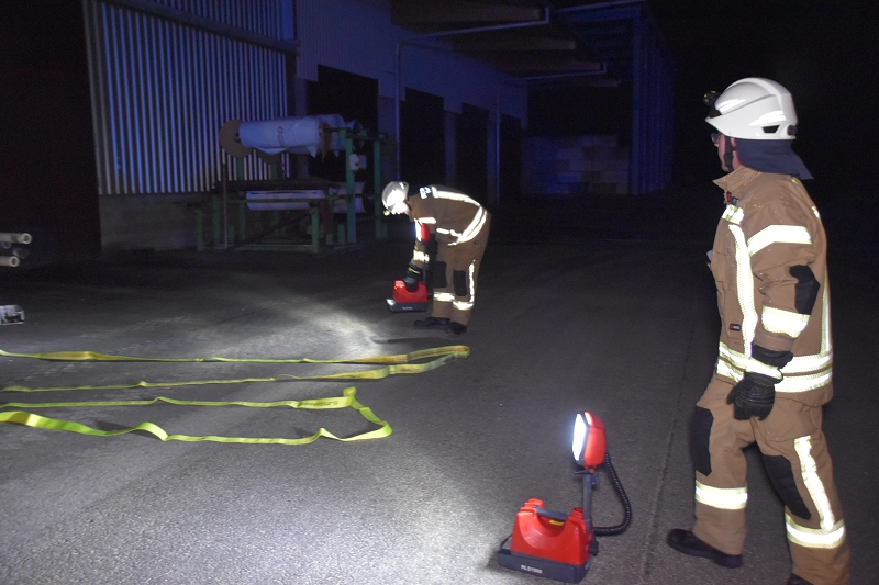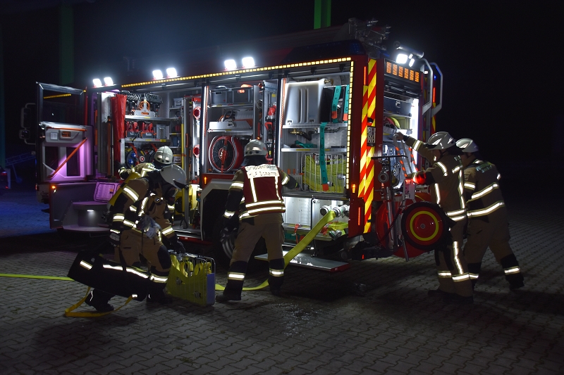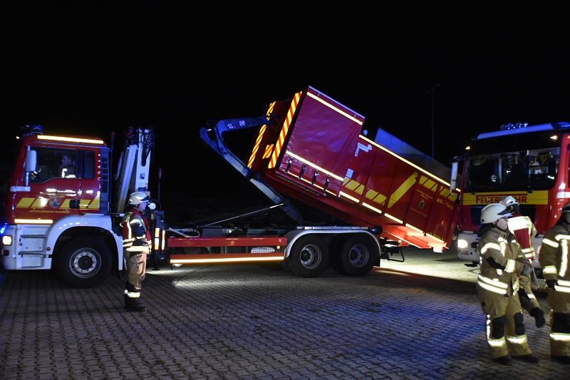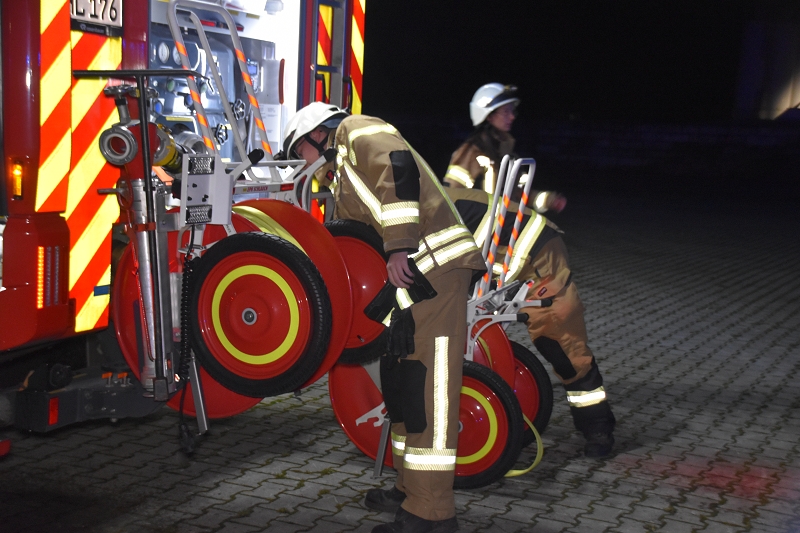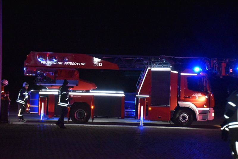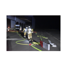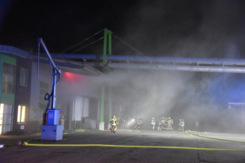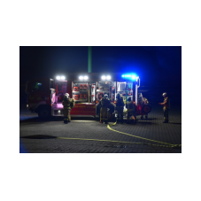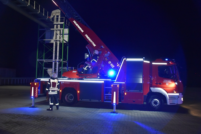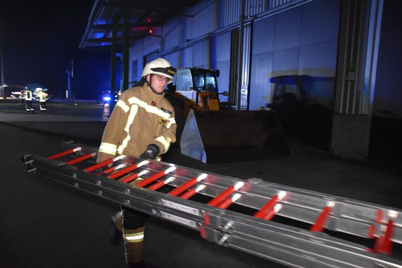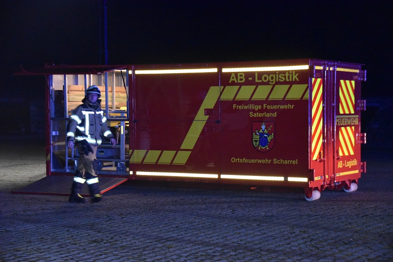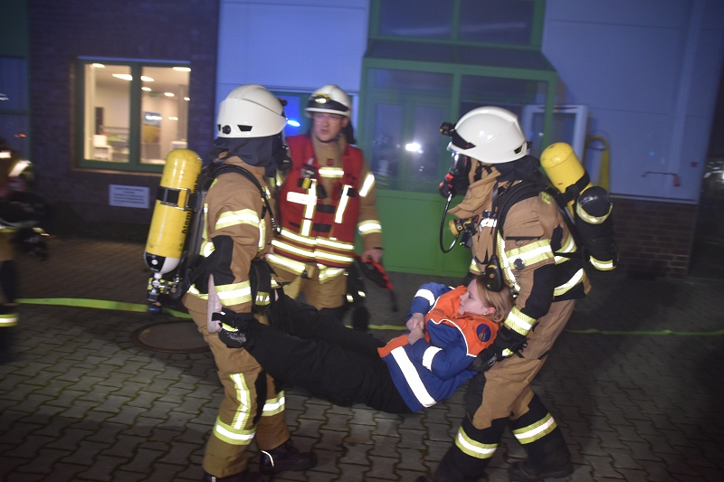 Beim Eintreffen der ersten Fahrzeuge sah man schon dichten Rauch aus den Hallen aufsteigen, unter Atemschutz wurde sofort die Menschenrettung durchgeführt. Ein Angriffstrupp holte innerhalb weniger Minuten drei Mitarbeiter aus den verqualmten Hallen. Der Rettungstrupp wartete vor der Halle um die Verletzten zu übernehmen. Diese wurden sofort an einen Sammelpunkt gebracht und vom First Responder Team versorgt. Auch die Person im Dachgeschoss wurde schnell gefunden und von den Kräften gerettet, diese Situation war sehr anspruchsvoll, da diese von oben an einer Leiter nach unten gebracht werden musste. Die beiden weiteren Personen auf der Förderbrücke wurden über die Drehleiter der Feuerwehr Friesoythe gerettet, dieses gelang den Helfern innerhalb weniger Minuten. Ein weiterer Teil der Übung war die Brandbekämpfung, da die Hydranten nicht zu öffnen waren, musste man das Löschwasser aus dem Küstenkanal holen. Mehrere hundert Meter B-Schlauch wurden zum AB- Wasser verlegt, dieser speiste dann die Löschfahrzeuge mit Wasser ein. Das neue Löschwasserrückhaltesystem was auf dem AB Logistik/ Rüst der Feuerwehr Scharrel verlagert ist kam bei diesem Einsatz auch zu tragen. Das Schlauchsystem der Feuerwehr Scharrel das mit Wasser aufgefüllt wird, verhindert ein Auslaufen des Löschwassers aus der Halle. Um 20:30 Uhr hieß es dann für alle eingesetzten Kräfte, Übungsende. Gemeindebrandmeister Hartmut Hanekamp bedankte sich bei allen Kameradinnen und Kameraden für ihr Engagement und der guten Zusammenarbeit auch über die Grenzen des Saterlandes. Ein besonderer Dank ging an RWG Ammerland-OstFriesland und an den Standortverantwortlichen Frank Lepper für die Bereitstellung der Hallen.