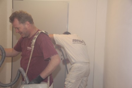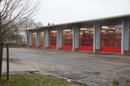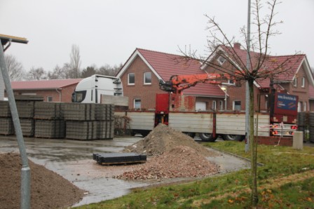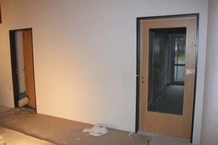 Freitag 12.12.2013 : Heute wurde die Pflastersteine für die vorderen Hof des Feuerwehrhauses geliefert. Die Flächen wurden heute noch Plan gemacht, die restlichen Steine wurde entfernt. Die Maler sind dabei den Flock an die Wand zu bringen. Die Fassadenbauer sind dabei die letzten Löcher zu schließen. Im Sozialtrakt und im Flur wurden die Türen eingebaut.