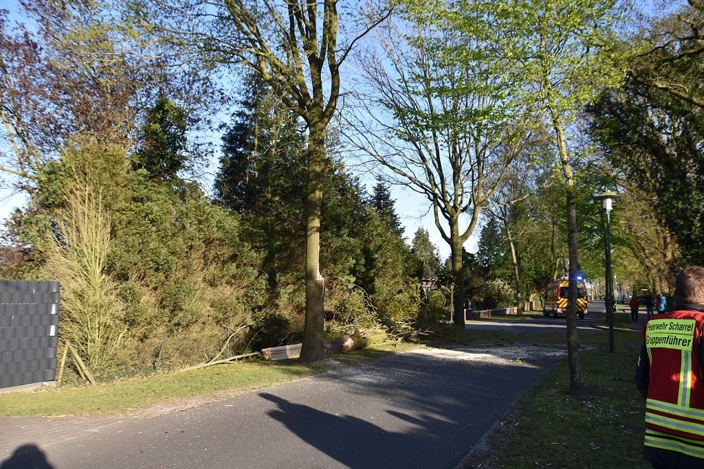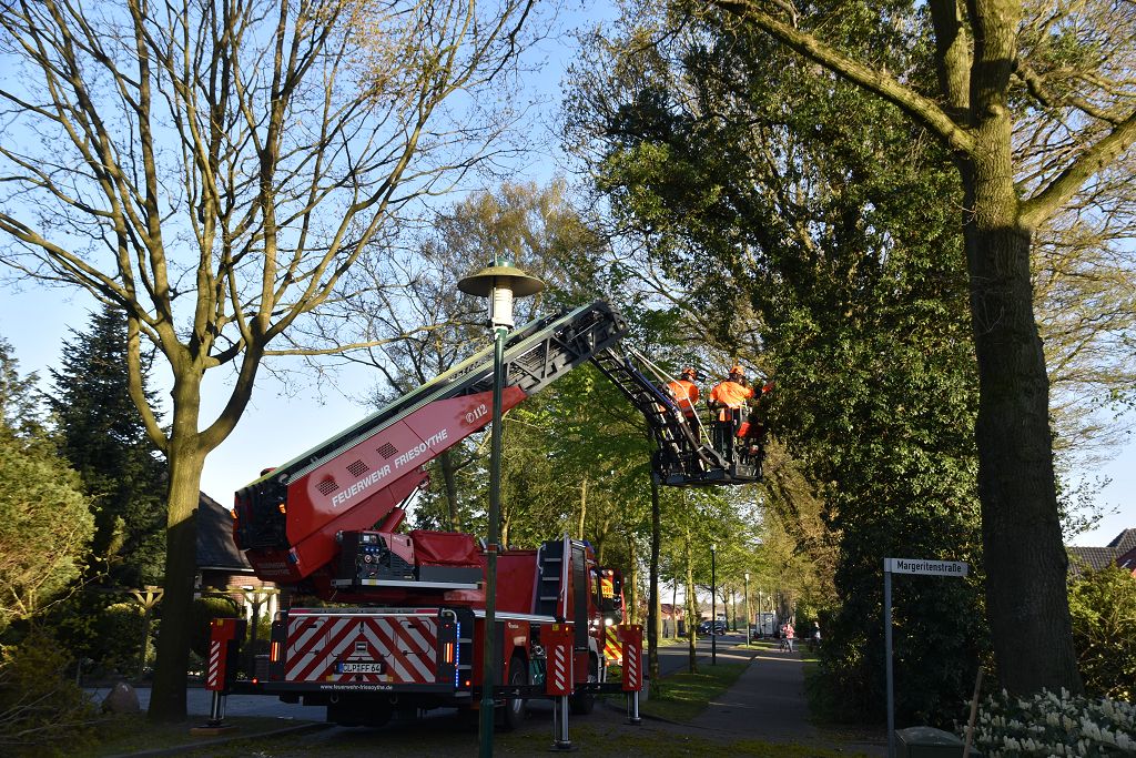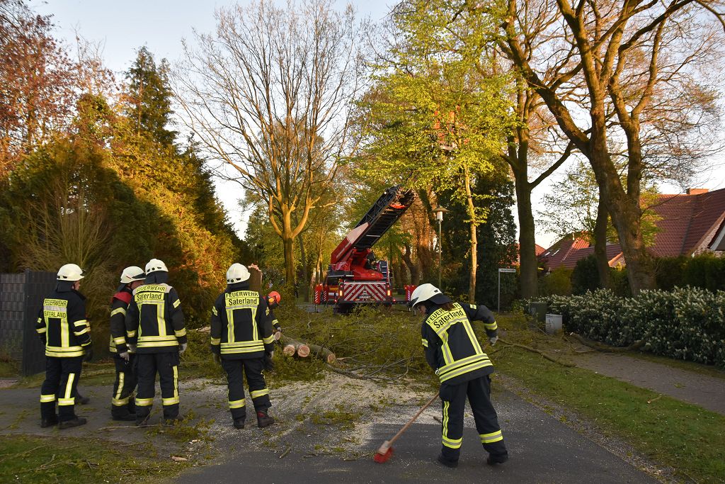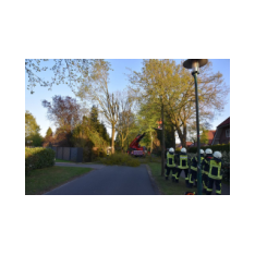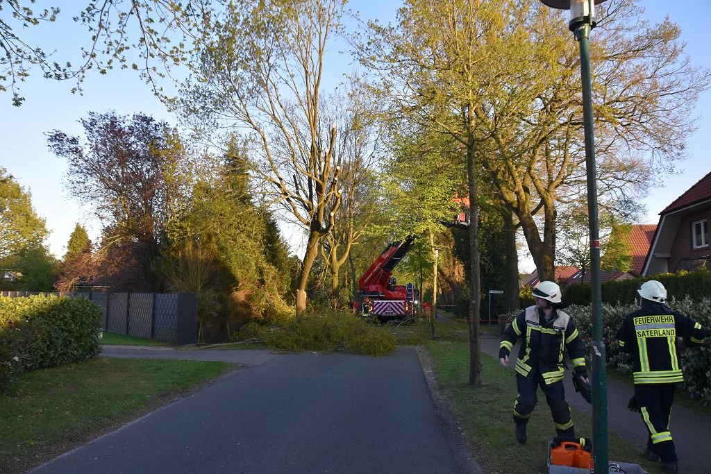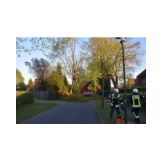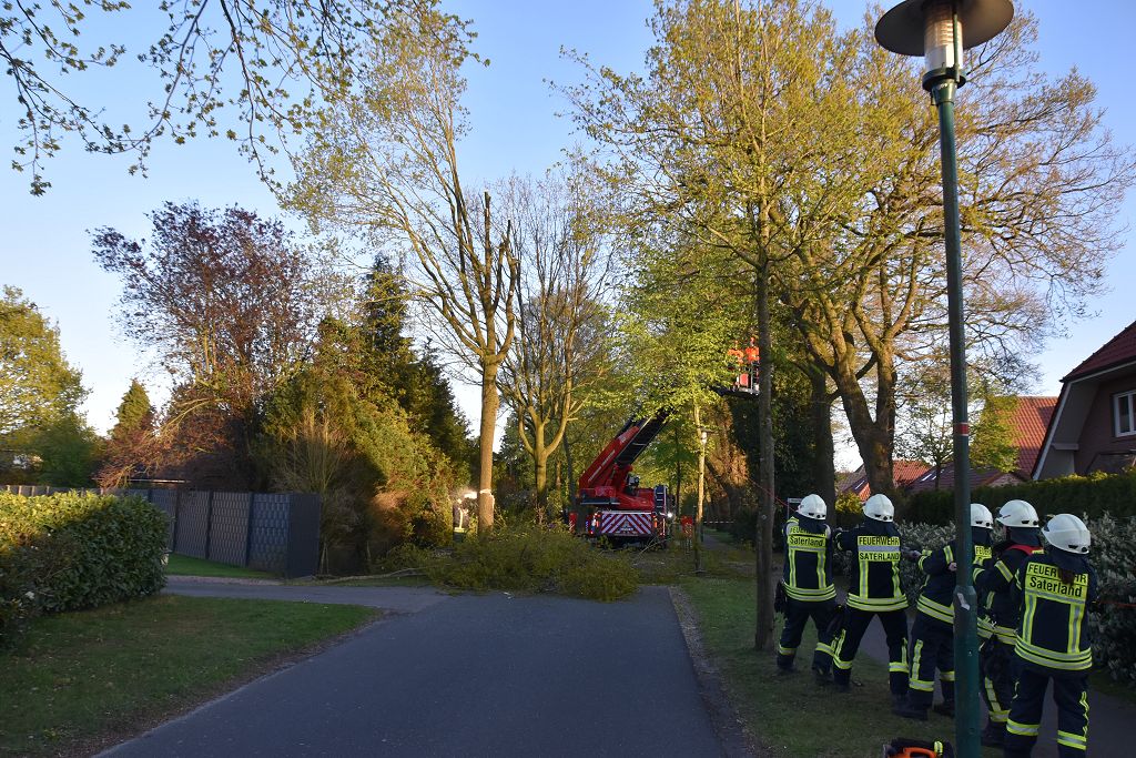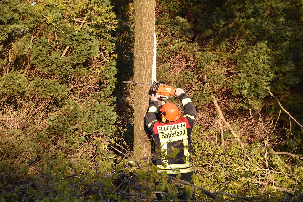 Scharrel/ Saterland (LK Cloppenburg) – Am Dienstagabend gegen 18:28 Uhr wurde die Feuerwehr Scharrel zur Heselberger Straße nach Scharrel gerufen. Hier drohte ein etwa 18 m hoher Baum auf die Straße zu fallen. Da schon ein Teil des Baumes auf der Straße lag, wurde sofort vor Ort beschlossen den kompletten Baum zur Sicherheit zu fällen. Auf Grund der Höhe des Baumes wurde vom Ortsbrandmeister der FF Scharrel die Drehleiter der Feuerwehr Friesoythe angefordert. Die Heselberger Straße wurde für die Fällung des Baumes vorübergehend abgesperrt. Nach etwa zwei Stunden war der Einsatz für die Feuerwehren aus Scharrel und Friesoythe beendet.
