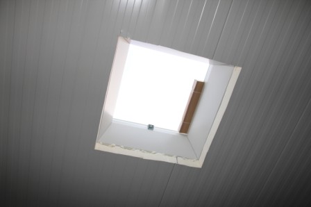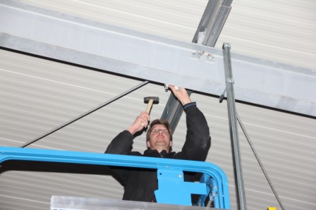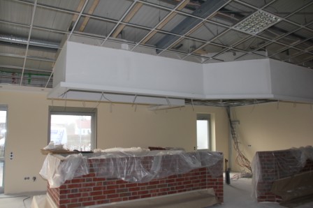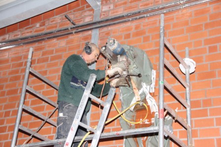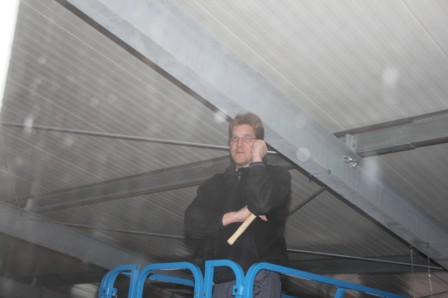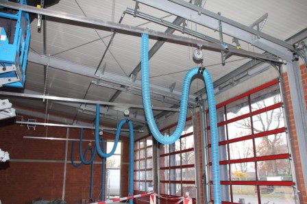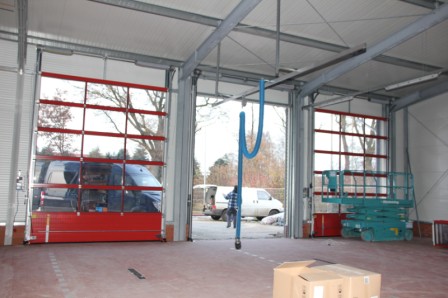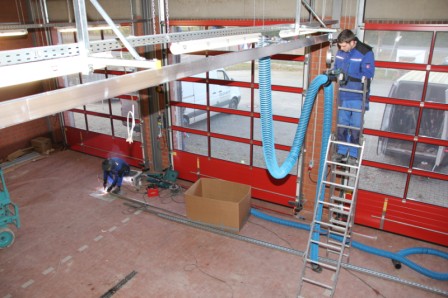 Mittwoch 26.11.2014 wurden im oberen Bereich der Alarmräume Dachluken eingebaut. In den rechten und mittleren Hallen sind schon die Absauganlagen angebaut worden. Ein Mitarbeiter bohrte 2 große Löcher für die Absaugrohre durch die Hallenwände. Im Sozialtrakt sind die Wände jetzt fertig gestrichen.In den mittleren Hallen werden grade die Kabelkanäle vom Chef angebaut. in den linken Hallen sind schon die nächsten beiden Tore eingebaut.