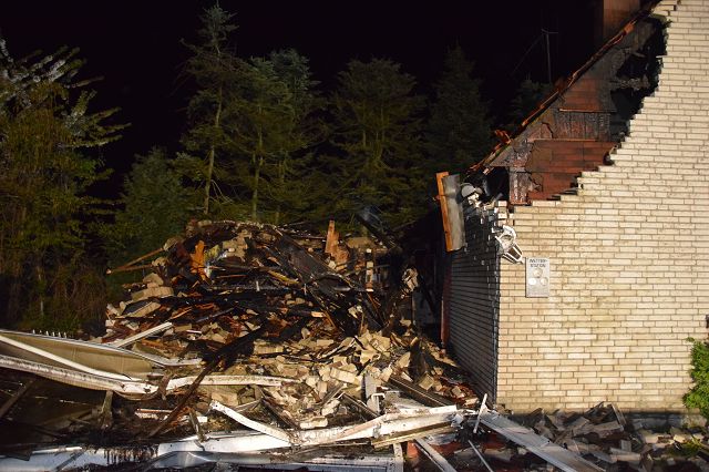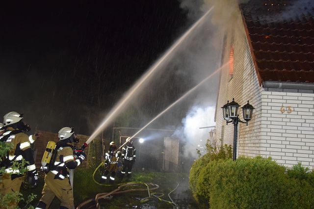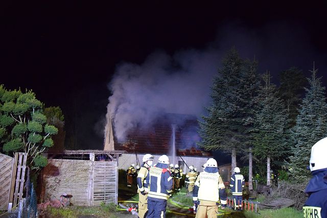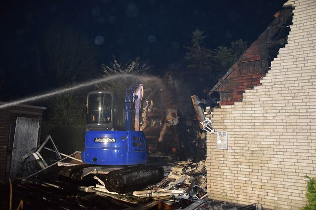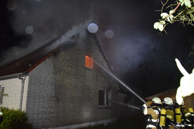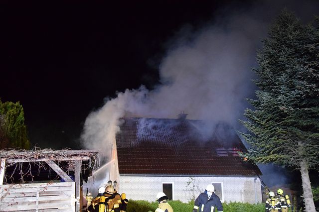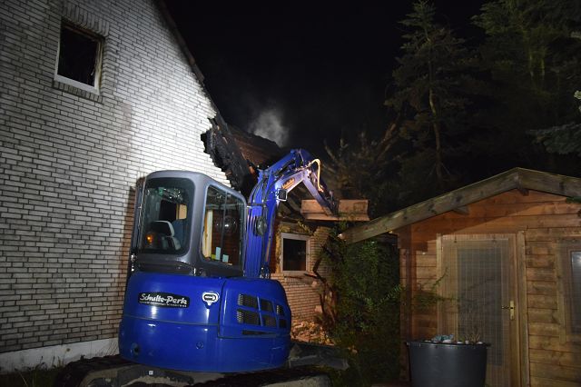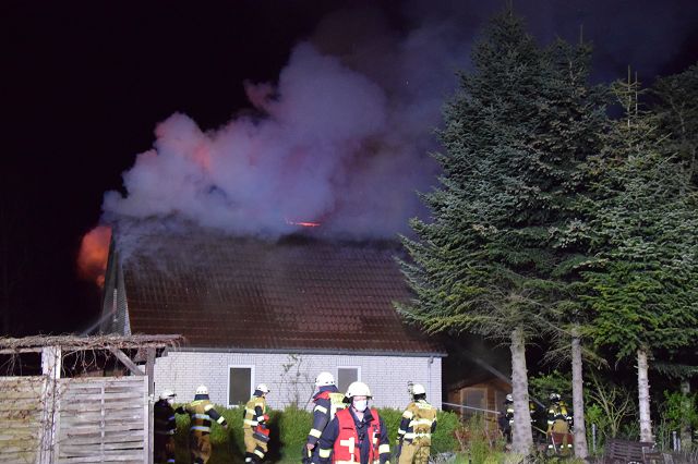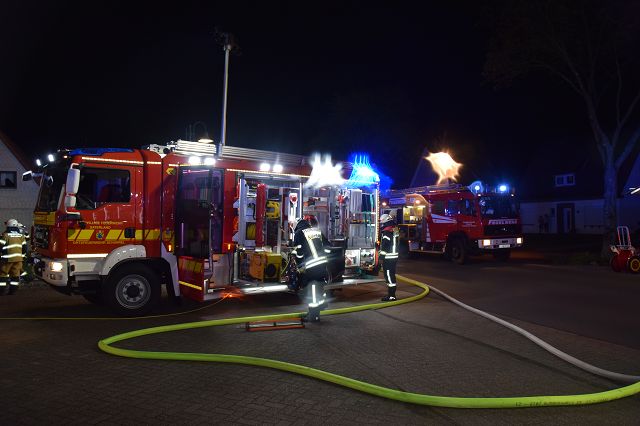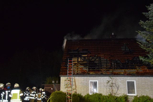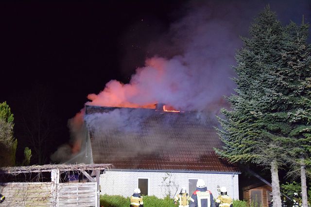 Saterland - Sedelsberg/ LK Cloppenburg - Zu einem Dachstuhlbrand an einem leerstehenden Wohnhaus wurden die Feuerwehren aus Scharrel und Ramsloh am Sonntagabend, den 09.05.2021 gegen 22:27 Uhr zur Hauptstraße nach Sedelsberg gerufen. Bei der Anfahrt der ersten Einsatzfahrzeuge konnte man schon einen großen Feuerschein sehen. Beim Eintreffen der ersten Einsatzkräfte stand schon der Dachstuhl auf der hinteren Seite des Hauses in Vollbrand. Sofort ging es für die Einsatzkräfte an die Löscharbeiten. Unter Atemschutz und Zeitweise mit über 6 C- Rohren wurde das Feuer bekämpft, desweiteren wurde eine Wasserversorgung verlegt. Mit über 70 Einsatzkräften wurde das Feuer bekämpft, ein Übergreifen der Flammen auf nahstehende Gebäude konnte verhindert werden. Da zwischen der Holzkonstruktion und dem Verblender teilweise das Feuer nicht gelöscht werden konnte, wurde im nach hinein ein Bagger bestellt der teilweise den Klinker abreißen musste, um das Feuer an der Holzkonstruktion zu löschen. Im Einsatz waren die Feuerwehren aus Scharrel und Ramsloh, Drohnengruppe Nord, das DRK, Polizei und die EWE.