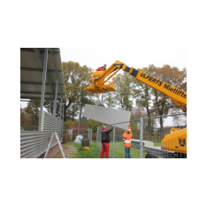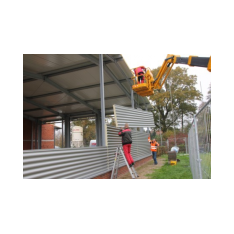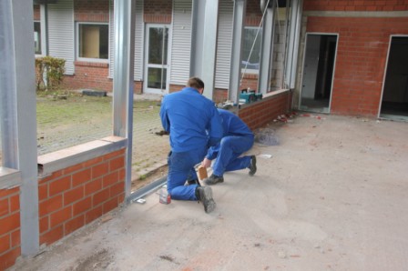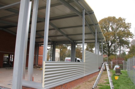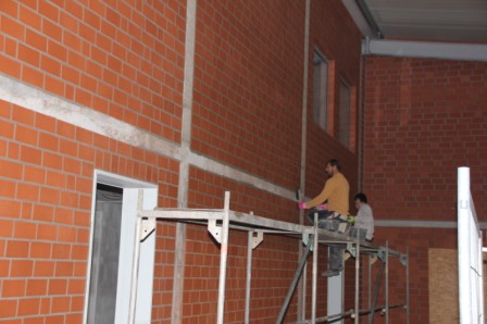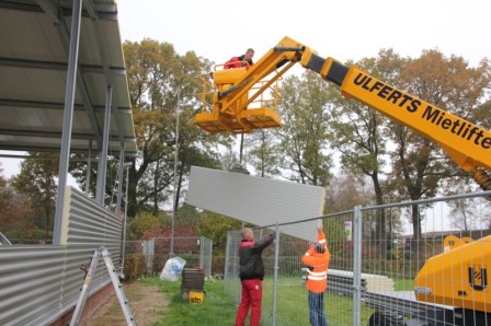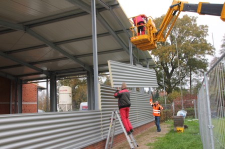 Am heutigen Donnerstag sind die Hallenbauer an den linken Hallen am Arbeiten, diese werden jetzt geschlossen. Mit schwerem Gerät wird Blech für Blech angebaut, damit die Halle schnellstens geschlossen wird. In den mittleren Hallen werden die Wände verfugt, auch hier kann man schon bald den Abschluss sehen. Weiter werden im Sozialtrakt die restlichen Kabel gezogen, dass der Maler hier bald anfangen kann zu Spachteln. Stahlbauer schweißen Winkel usw. an den neuen Einfahrten an, dort werden dann die Tore angebaut.