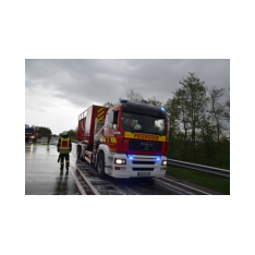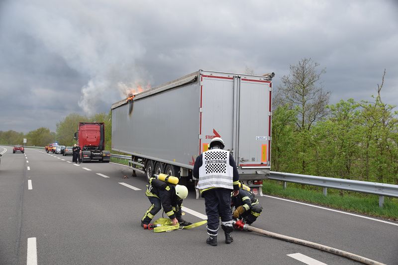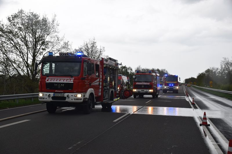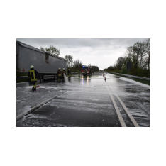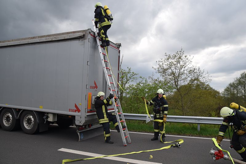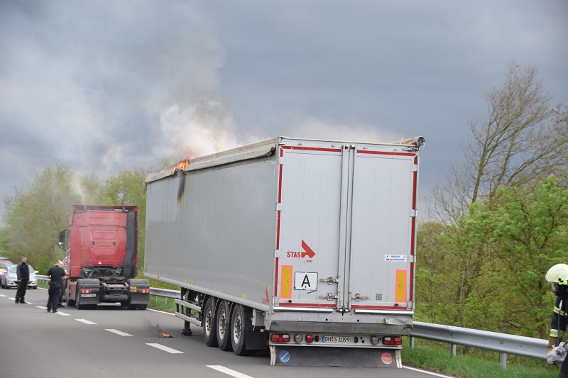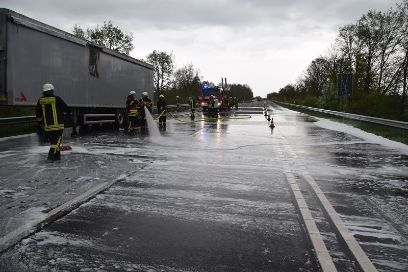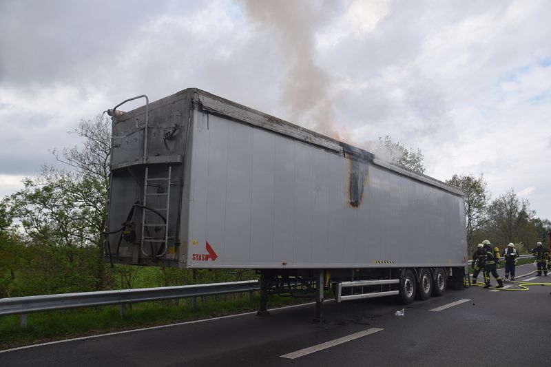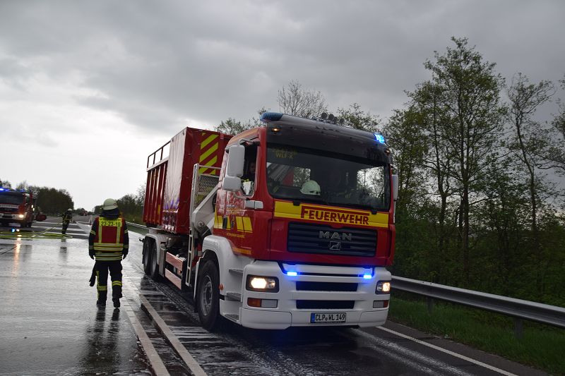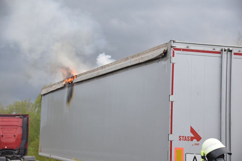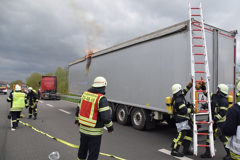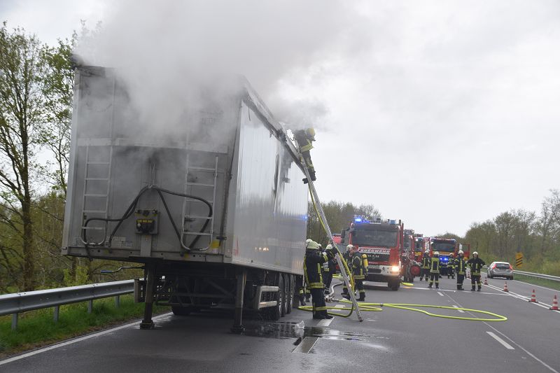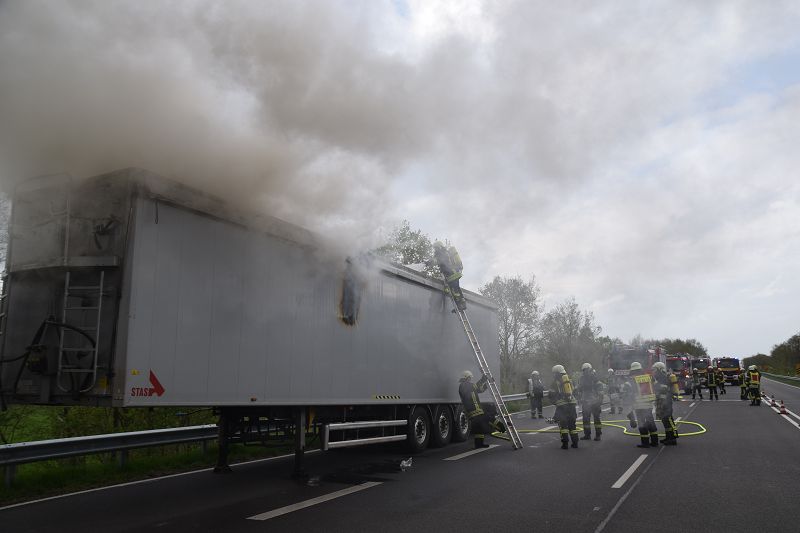 Saterland / OT Strücklingen – Am Dienstagnachmittag den 24.04.2018 gegen 17:28 Uhr wurden die Feuerwehren aus Ramsloh und Scharrel zu einem Fahrzeugbrand auf die B 72 zwischen Strücklingen und Ramsloh gerufen. Ein LKW Fahrer der mit seinem Sattelzug in Richtung Ramsloh unterwegs war, bemerkte während der Fahrt das aus seinem Auflieger dichter Qualm aufstieg. Sofort fuhr er auf den Standstreifen und koppelte seine Zugmaschine vom Auflieger ab. Beim Eintreffen der Feuerwehr loderten schon die Flammen aus dem Auflieger. Unter Atemschutz wurde sofort das Feuer gelöscht. Die B 72 wurde in Richtung Ramsloh zeitweise voll gesperrt