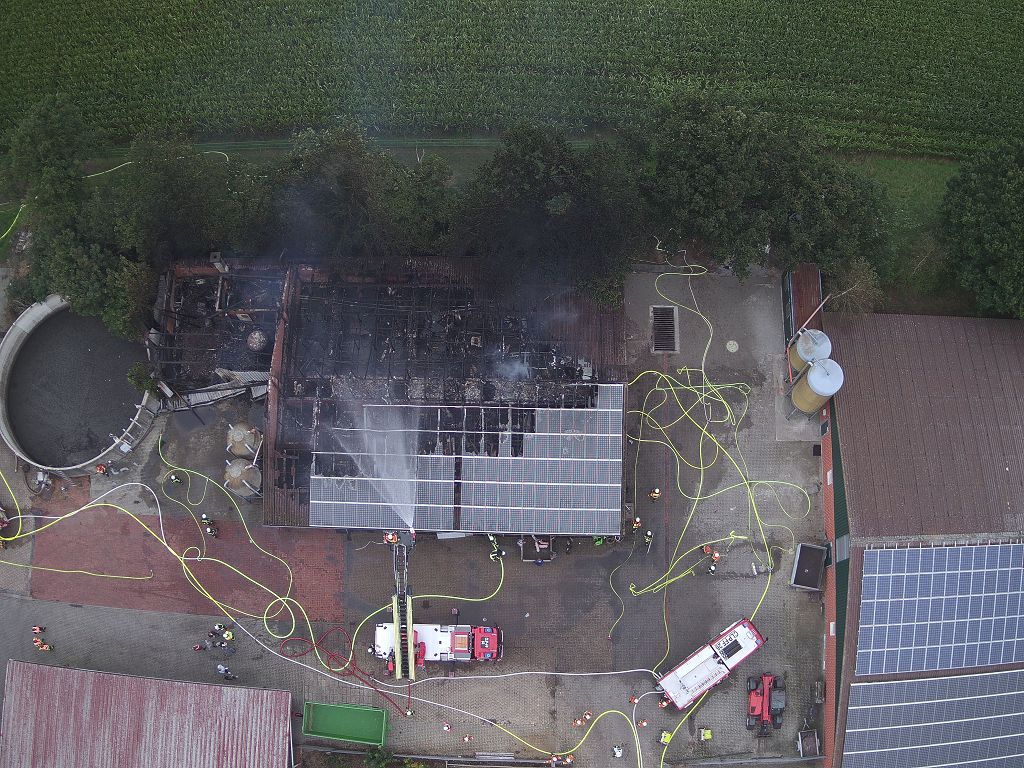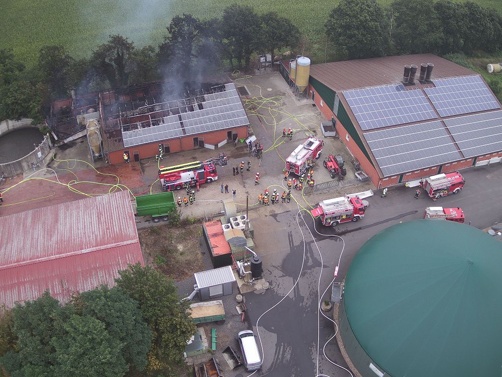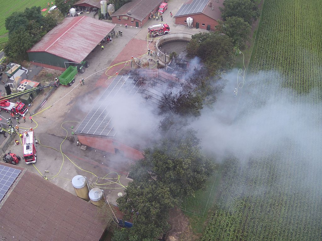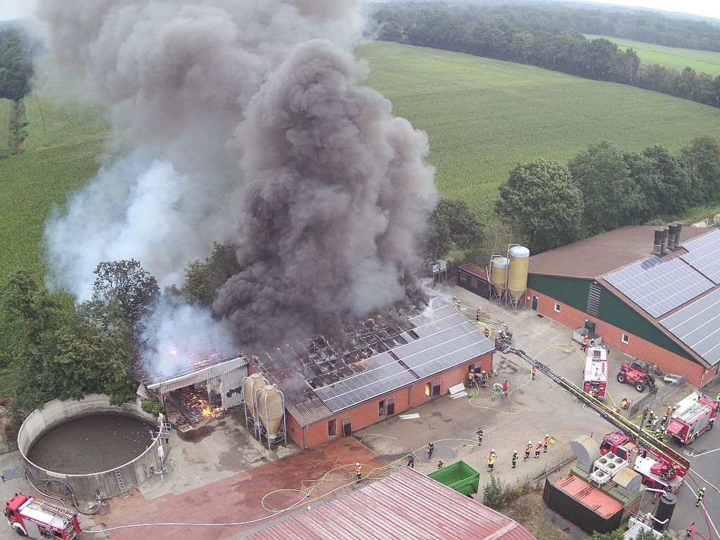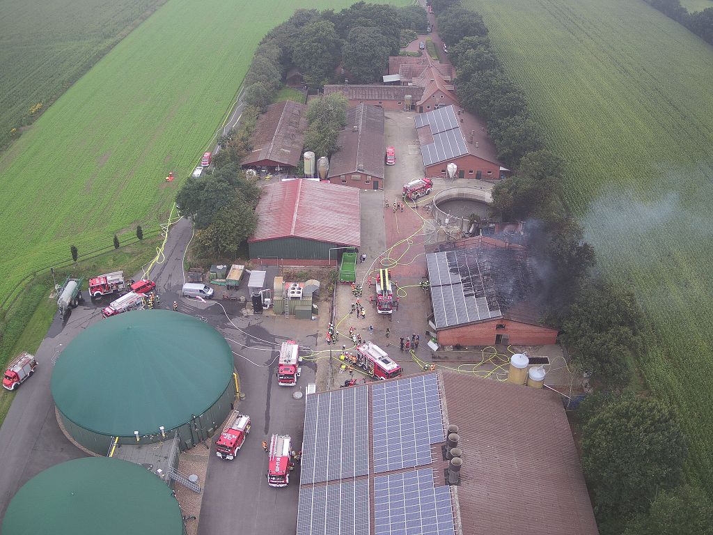 Friesoythe (LK Cloppenburg) – Zu einem Gebäudebrand am Dienstag, 08.09.2020 gegen 09:17 Uhr wurden die Feuerwehren Friesoythe, Altenoythe, Gehlenberg, Markhausen, Bösel, Scharrel und Garrel sowie der ABC Dienst Cloppenburg, die Drohneneinheit des Landkreises Cloppenburg und der ELW 2 aus Cloppenburg in die Pehmertanger Straße in Friesoythe gerufen. Auf der Anfahrt konnte man schon eine riesige Rauchwolke erkennen, beim Eintreffen der ersten Einsatzkräfte sah man schon, dass ein Schweinestall und eine angrenzende Werkstatt in Vollbrand standen. Im Stallgebäude befanden sich rund 950 Schweine, der Betreiber der Anlage schaffte es noch ca. 100 Schweine zu retten bevor die Einsatzkräfte eintrafen. Die ersten Kräfte versuchten unter Atemschutz weitere Schweine aus dem Stall zu treiben, insgesamt konnten nur rund 120 Schweine gerettet werden. Weiter Einsatzkräfte legten eine ca. 3500 m lange Wasserversorgung. Ein Übergreifen der Flammen auf andere Gebäudeteile und der Biogasanlage wurde von den insgesamt 200 eingesetzten Kräften verhindert. Vorsorglich wurden auch zwei Rettungswagen zur Einsatzstelle gerufen, diese brauchten aber nicht eingreifen. Auch die EWE war vor Ort, weil auf dem 30m x 40m großen Stall eine Photovoltaikanlage installiert war, dies war für die Brandbekämpfung eine große Herausforderung. Alarmiert wurde auch die Tierrettung, sowie das Veterinäramt aus Cloppenburg.