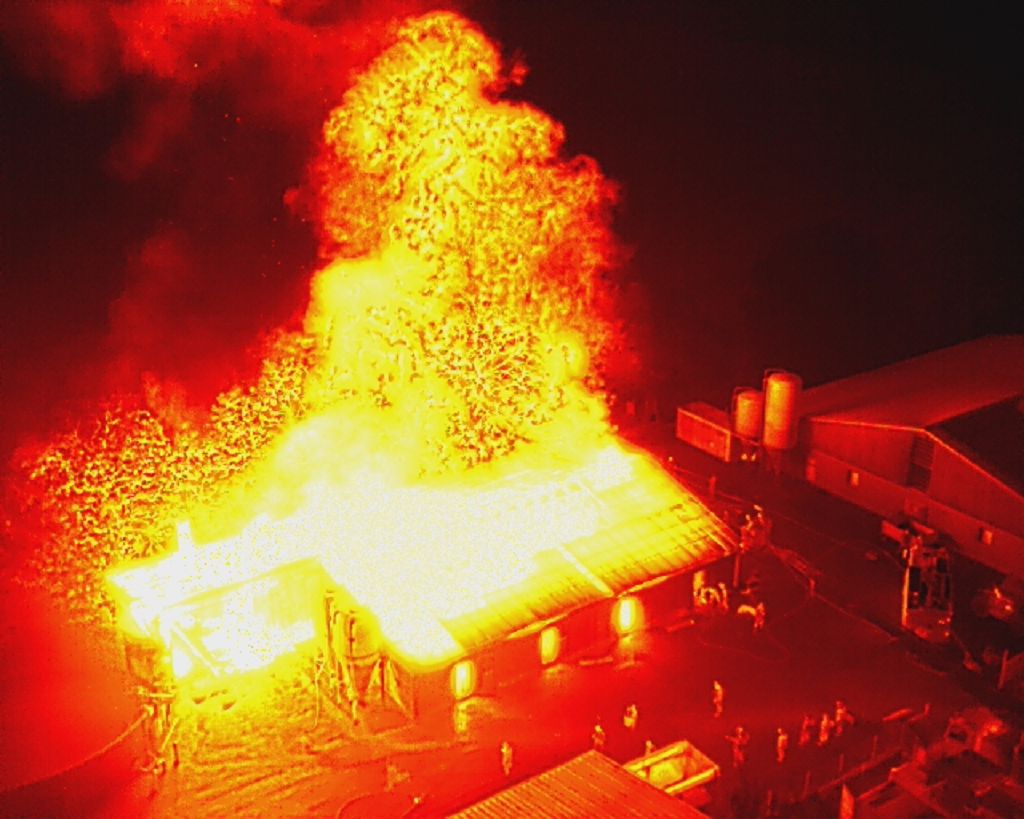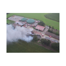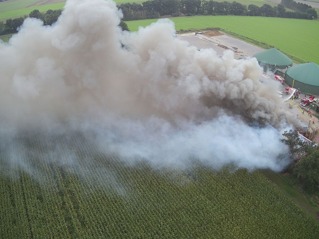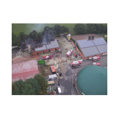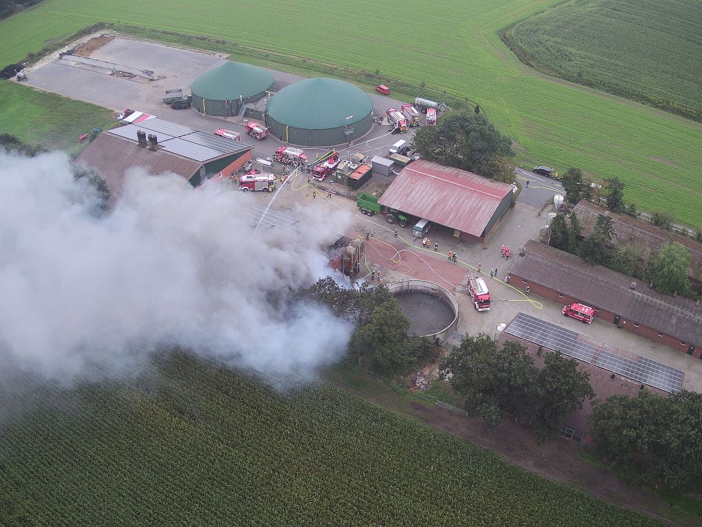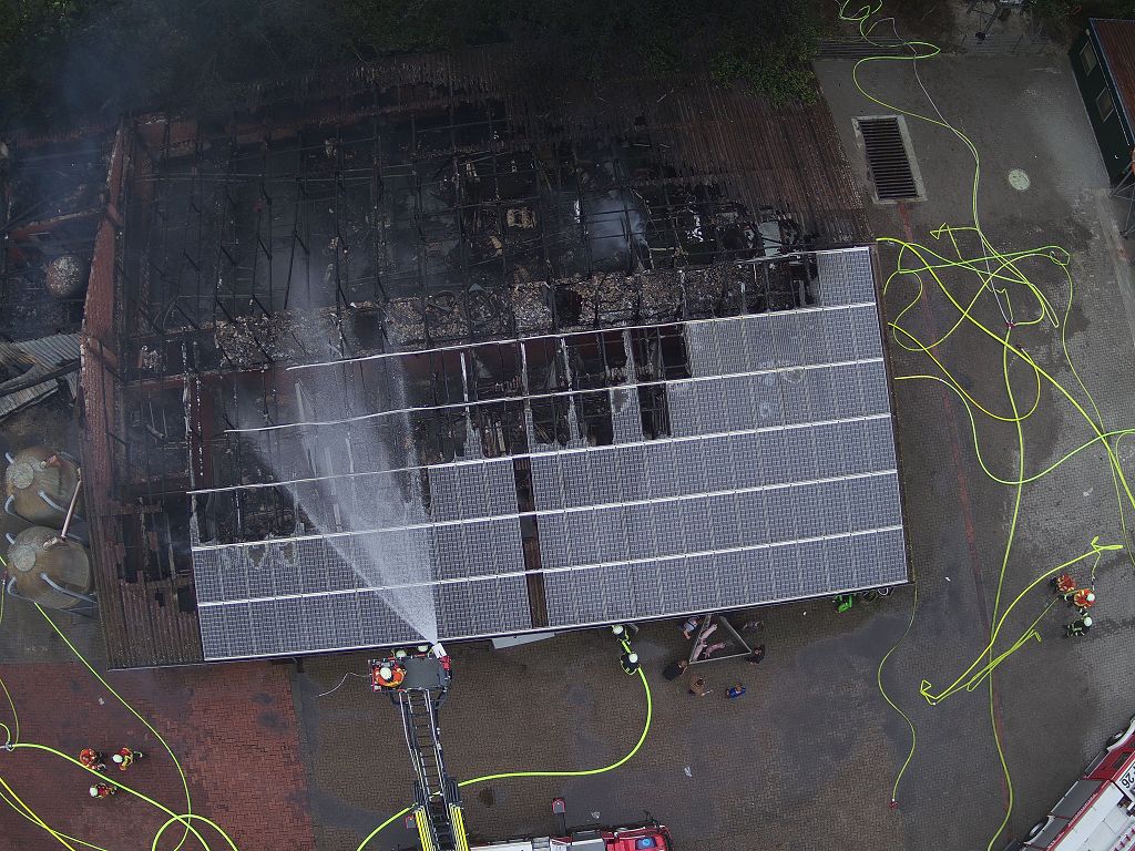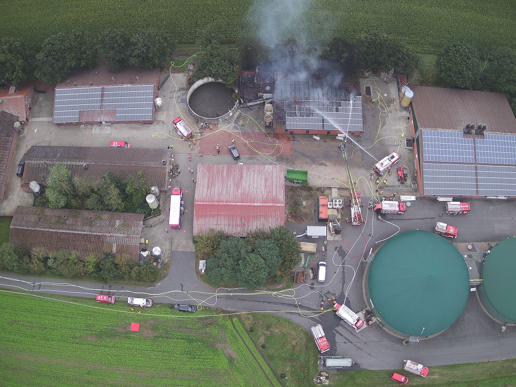 Friesoythe (LK Cloppenburg) – Zu einem Gebäudebrand am Dienstag, 08.09.2020 gegen 09:17 Uhr wurden die Feuerwehren Friesoythe, Altenoythe, Gehlenberg, Markhausen, Bösel, Scharrel und Garrel sowie der ABC Dienst Cloppenburg, die Drohneneinheit des Landkreises Cloppenburg und der ELW 2 aus Cloppenburg in die Pehmertanger Straße in Friesoythe gerufen. Auf der Anfahrt konnte man schon eine riesige Rauchwolke erkennen, beim Eintreffen der ersten Einsatzkräfte sah man schon, dass ein Schweinestall und eine angrenzende Werkstatt in Vollbrand standen. Im Stallgebäude befanden sich rund 950 Schweine, der Betreiber der Anlage schaffte es noch ca. 100 Schweine zu retten bevor die Einsatzkräfte eintrafen. Die ersten Kräfte versuchten unter Atemschutz weitere Schweine aus dem Stall zu treiben, insgesamt konnten nur rund 120 Schweine gerettet werden. Weiter Einsatzkräfte legten eine ca. 3500 m lange Wasserversorgung. Ein Übergreifen der Flammen auf andere Gebäudeteile und der Biogasanlage wurde von den insgesamt 200 eingesetzten Kräften verhindert. Vorsorglich wurden auch zwei Rettungswagen zur Einsatzstelle gerufen, diese brauchten aber nicht eingreifen. Auch die EWE war vor Ort, weil auf dem 30m x 40m großen Stall eine Photovoltaikanlage installiert war, dies war für die Brandbekämpfung eine große Herausforderung. Alarmiert wurde auch die Tierrettung, sowie das Veterinäramt aus Cloppenburg.