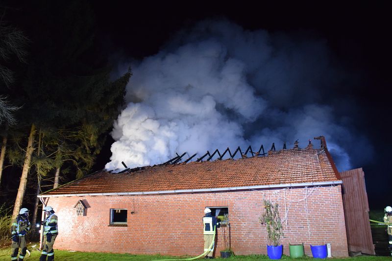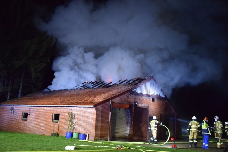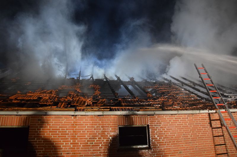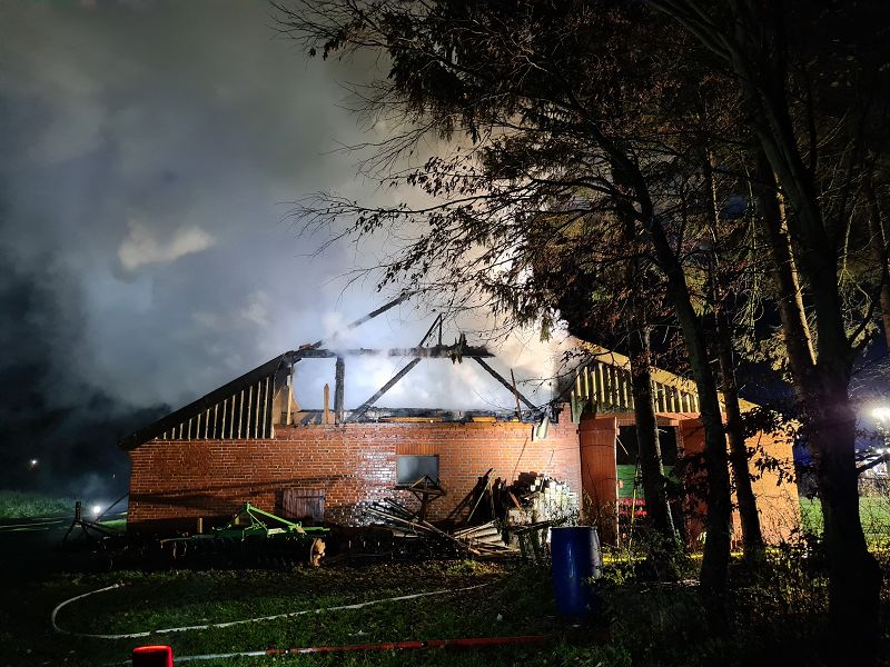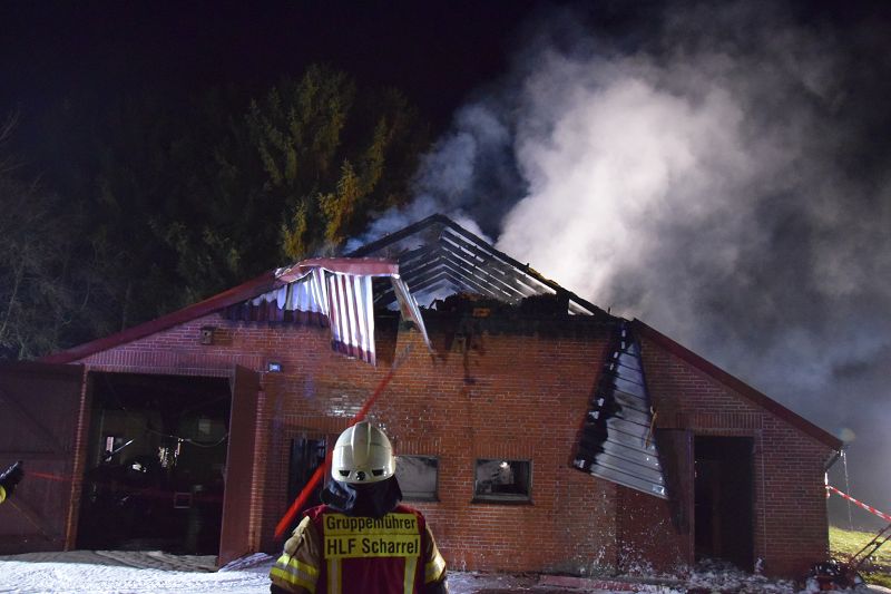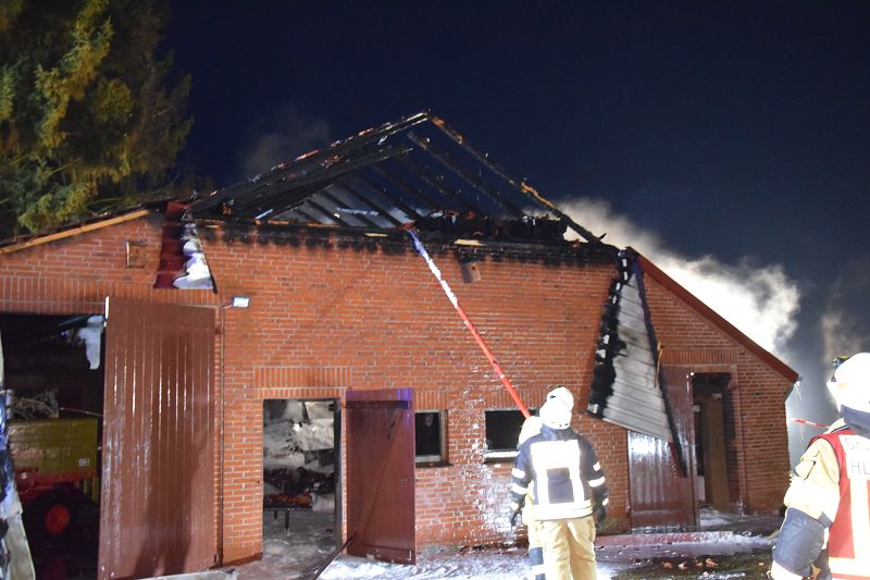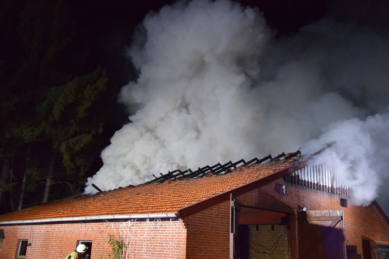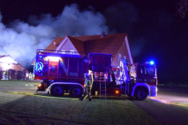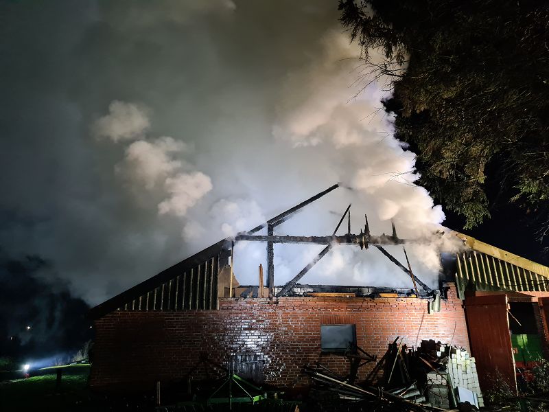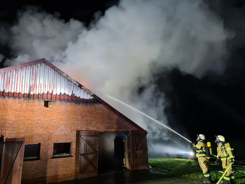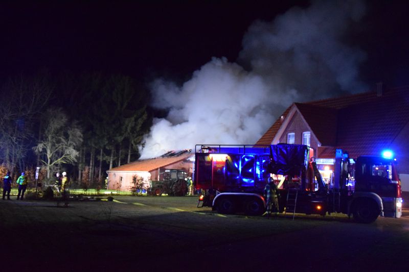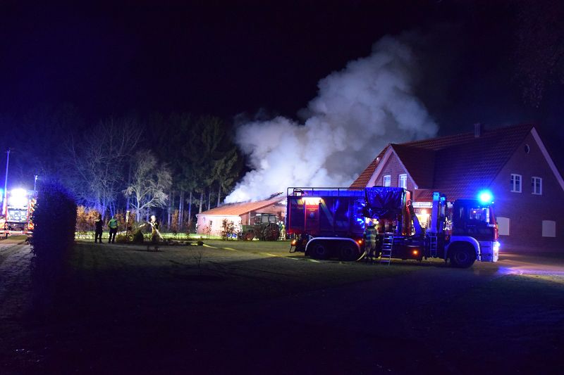 Sedelsberg/ Saterland (LK Cloppenburg) – Zu einem Gebäudebrand wurden am Donnerstag, den 09.12.2021 gegen 04:58 Uhr die Feuerwehren aus Scharrel und Ramsloh zum Erlenweg nach Sedelsberg gerufen. Schon auf der Anfahrt sah man eine Rauchsäule aufsteigen, beim Eintreffen der ersten Einsatzkräfte stand der Dachstuhl komplett in Flammen. Sofort wurden mehrere C-Schläuche verlegt, so dass man unter Atemschutz das Feuer löschen konnte. Weitere Einsatzkräfte waren damit beschäftigt eine über 500m lange Wasserversorgung zu verlegen. Ein Übergreifen auf das Wohnhaus konnte durch das schnelle Handeln der Einsatzkräfte aus Scharrel und Ramsloh verhindert werden. Tiere befanden sich nicht in dem Stallgebäude, Personen kamen nicht zu schaden. Die Feuerwehren aus Scharrel und Ramsloh waren mit 50 Einsatzkräften und 13 Fahrzeugen vor Ort. Auch im Einsatz war das DRK und die Polizei.