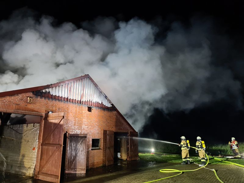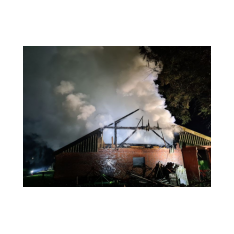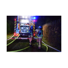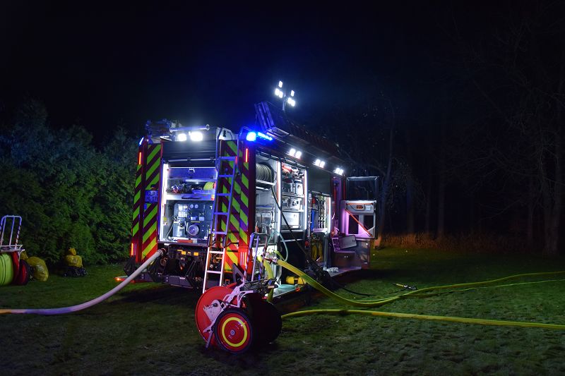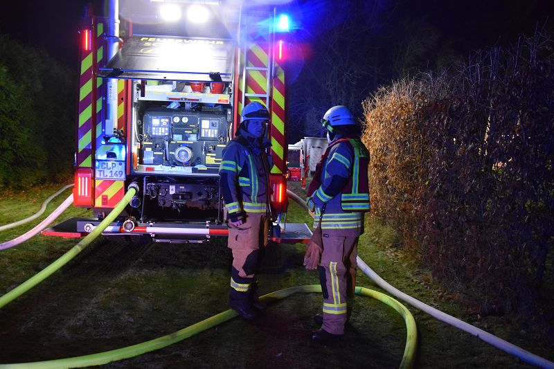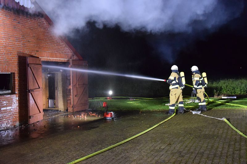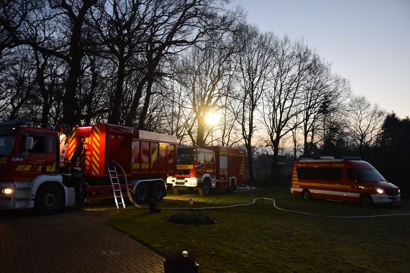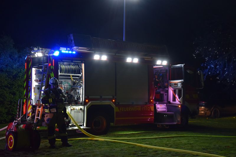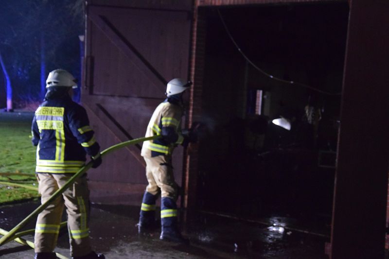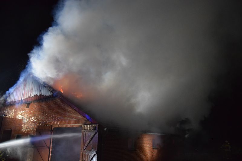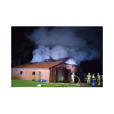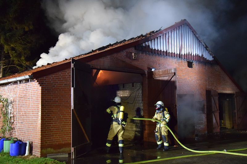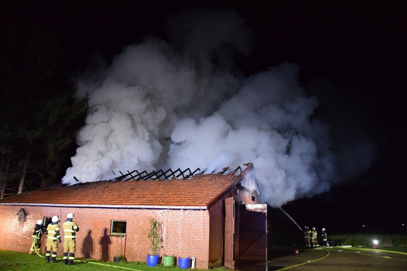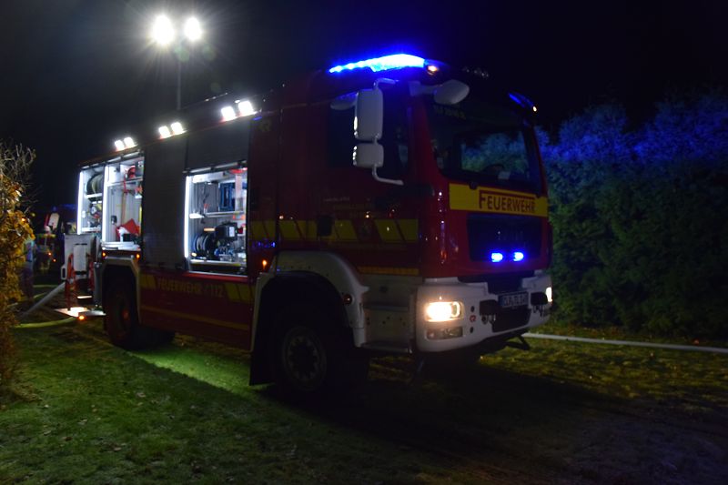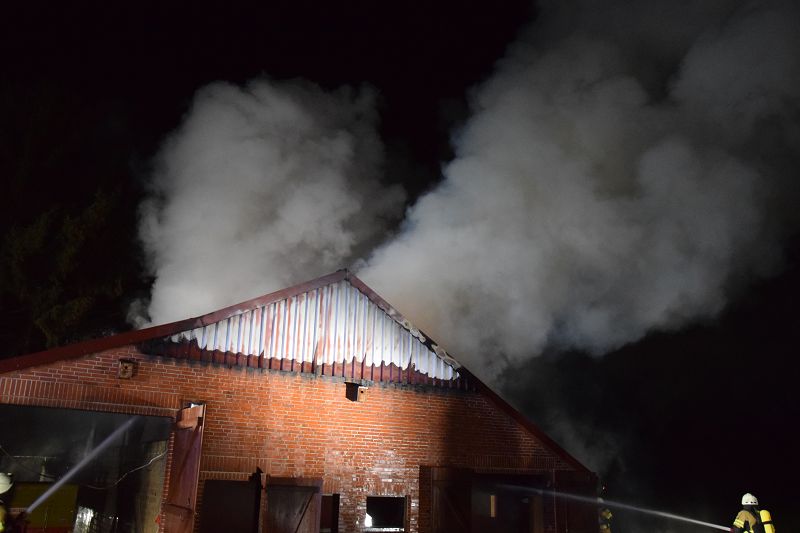Sedelsberg/ Saterland (LK Cloppenburg) – Zu einem Gebäudebrand wurden am Donnerstag, den 09.12.2021 gegen 04:58 Uhr die Feuerwehren aus Scharrel und Ramsloh zum Erlenweg nach Sedelsberg gerufen. Schon auf der Anfahrt sah man eine Rauchsäule aufsteigen, beim Eintreffen der ersten Einsatzkräfte stand der Dachstuhl komplett in Flammen. Sofort wurden mehrere C-Schläuche verlegt, so dass man unter Atemschutz das Feuer löschen konnte. Weitere Einsatzkräfte waren damit beschäftigt eine über 500m lange Wasserversorgung zu verlegen. Ein Übergreifen auf das Wohnhaus konnte durch das schnelle Handeln der Einsatzkräfte aus Scharrel und Ramsloh verhindert werden. Tiere befanden sich nicht in dem Stallgebäude, Personen kamen nicht zu schaden. Die Feuerwehren aus Scharrel und Ramsloh waren mit 50 Einsatzkräften und 13 Fahrzeugen vor Ort. Auch im Einsatz war das DRK und die Polizei.