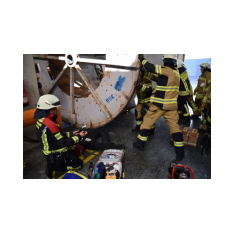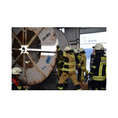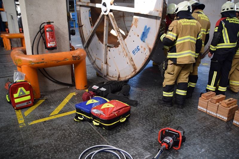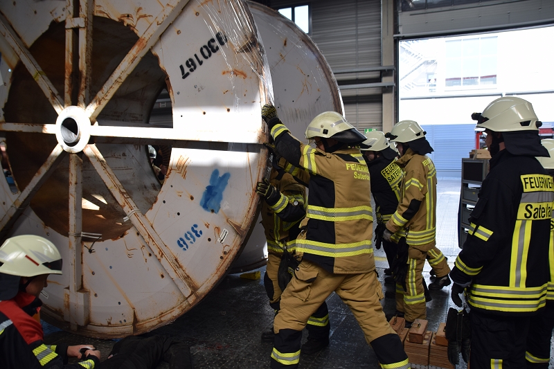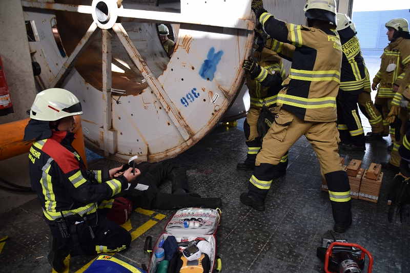 Mitarbeiter unter die Stahlkabeltrommel geraten und eingeklemmt worden. Weitere
