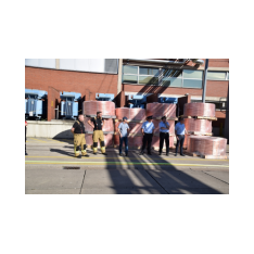 Mitarbeiter beim Wechsel der Stahlkabeltrommeln an einer Maschine kurzzeitig