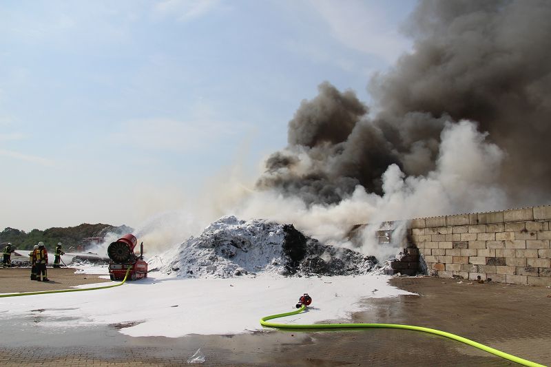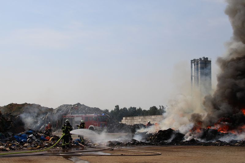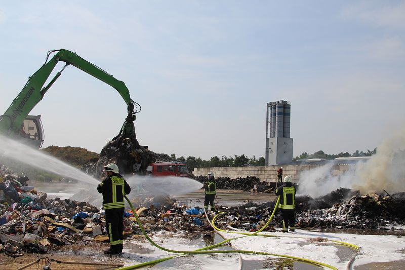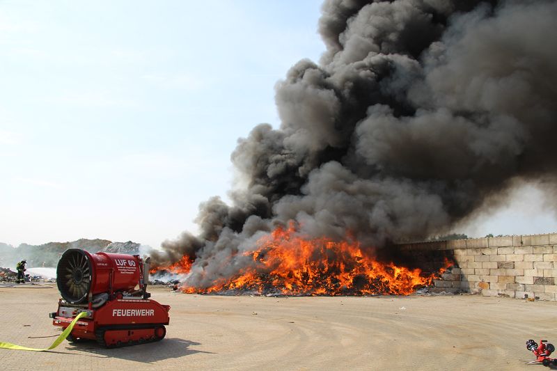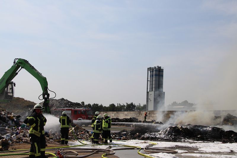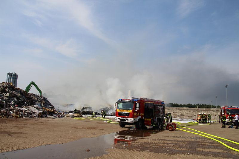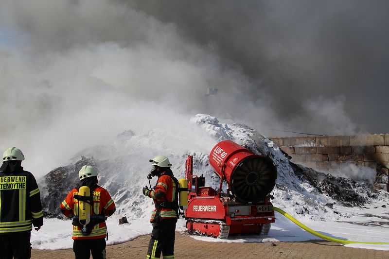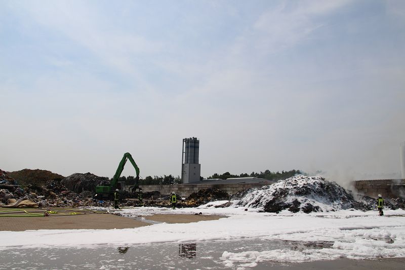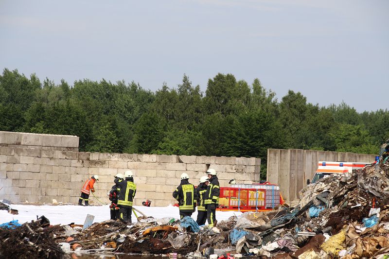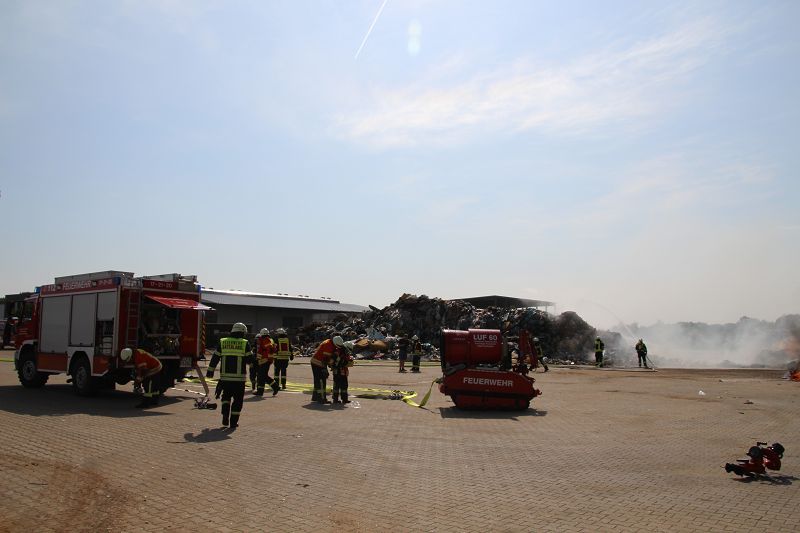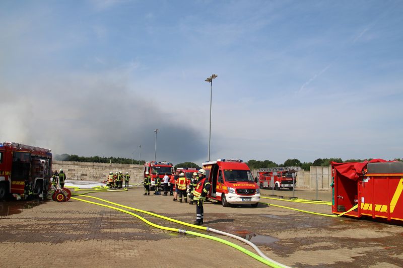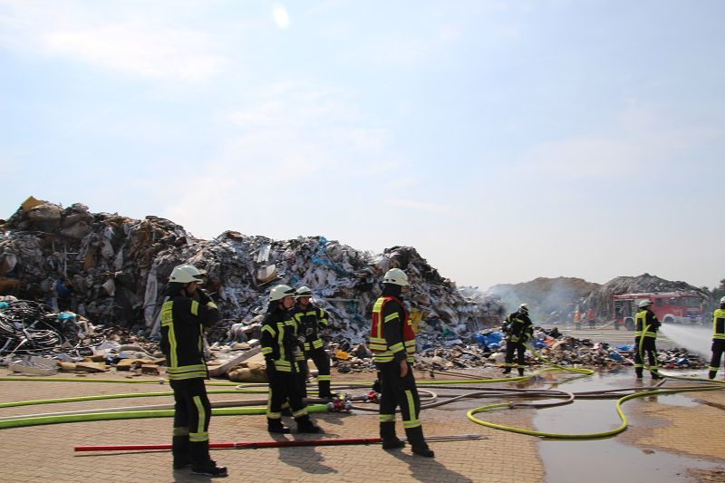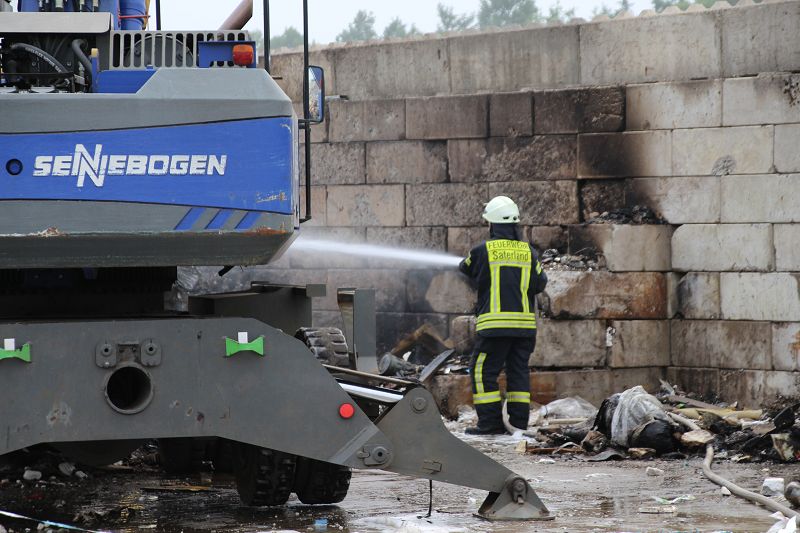 Saterland – Sedelsberg – LK Cloppenburg – Zu einem Großbrand wurden die Feuerwehren aus Scharrel, Ramsloh, Friesoythe, Gehlenberg, Markhausen und Altenoythe, die LUF Gruppe, der ELW 2 aus Cloppenburg, die Drohnengruppe, der ABC Dienst Cloppenburg, das DRK, Polizei und ein Polizeihubschrauber aus Rastede am 8. Juni gegen 09:52 Uhr zum C-Port nach Sedelsberg gerufen. Bereits auf der Anfahrt konnte man eine große schwarze Rauchsäule am Horizont erkennen. Beim Eintreffen sah man schon, dass ein 100m mal 30m großer Müllhaufen in Vollbrand stand. Sofort wurde der LUF 60 (Löschunterstützungsfahrzeug) bereit gemacht, weiterhin wurde die Wasserversorgung sichergestellt. Mit einigen C-Rohren und mit der Unterstützung des LUF konnte das Feuer schnell unter Kontrolle gebracht werden. Zeitweise wurde die Sedelsberger Starße von der Abfahrt C-Port bis zur Kreuzung B 401 voll für den Verkehr gesperrt. Aufgrund der starken Rauchentwicklung wurde im Radio darum gebeten, Fenster und Türen geschlossen zu halten. Die Löscharbeit zogen sich bis ca. 16:00 Uhr hin, da man die Müllhaufen Stück für Stück abtragen musste. Für die Wehrmänner der Feuerwehr Scharrel die die restlichen Ablöscharbeiten absolvierten war es eine anstrengende Arbeit, da es bei sommerlichen 29 Grad doch sehr heiß unter der Einsatzkleidung war, zudem kam natürlich auch noch die Hitze des Brandherdes. Hier musste natürlich sehr viel Getrunken werden, dafür sorgten zwei Kameraden der Wehr, sie holten erst einmal einige Kisten Wasser. Im Viertelstunden Tackt wurden die Kameraden nach und nach ausgewechselt, somit konnten die anderen Kameraden erst einmal verschnaufen. Für die Bürger bestand zu keiner Zeit eine Gefahr, Personen wurden nicht verletzt.