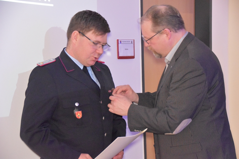 Ehrungen: Bürgermeister Thomas Otto überreichte den Stellvertretenden Ortsbrandmeister Lukas von Kajdacsy das Niedersächsische Feuerwehr Ehrenzeichen für 25 Jahre Mitgliedschaft in der Feuerwehr.