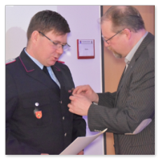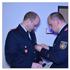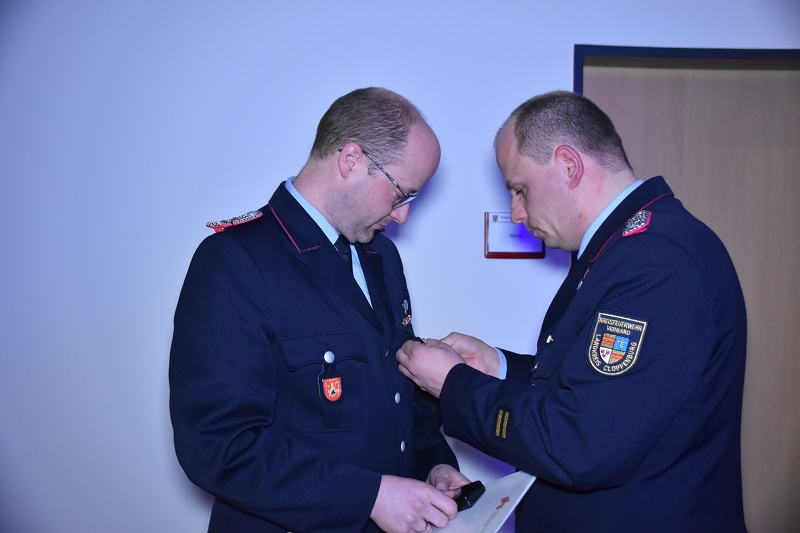 Nach seinem Grußwort hatte der Stellvertretende Kreisbrandmeister noch eine besondere Überraschung für Ortbrandmeister Michael Wöste in petto. Abshof überreichte OBM Michael Wöste die Ehrennadel in Silber des Landesfeuerwehrverbandes Niedersachsen. Sichtlich gerührt bedankte sich Wöste bei Abshof und bei seinen Kameradinnen und Kameraden.