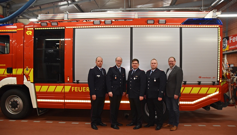 Bild: v.l.n.r.: Stellv. Kreisbrandmeister Stefan Abshof, Ortsbrandmeister Michael Wöste, Stellv. Ortsbrandmeister Lukas von Kajdacsy, Stellv. Gemeindebrandmeister Kevin Heese, Bürgermeister Thomas Otto