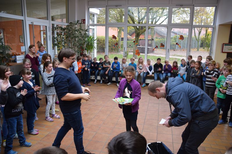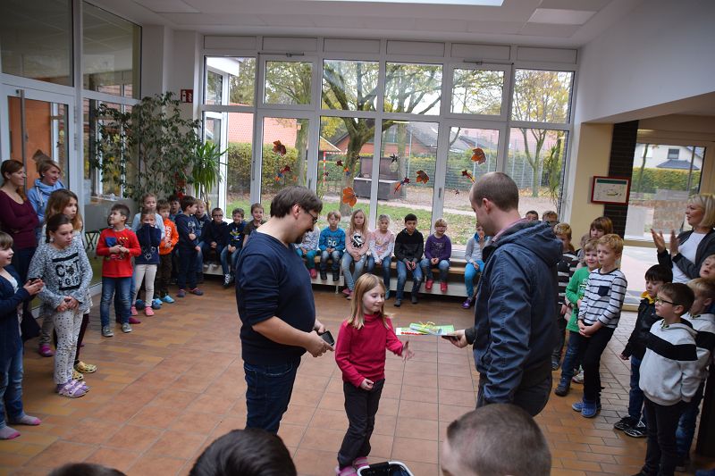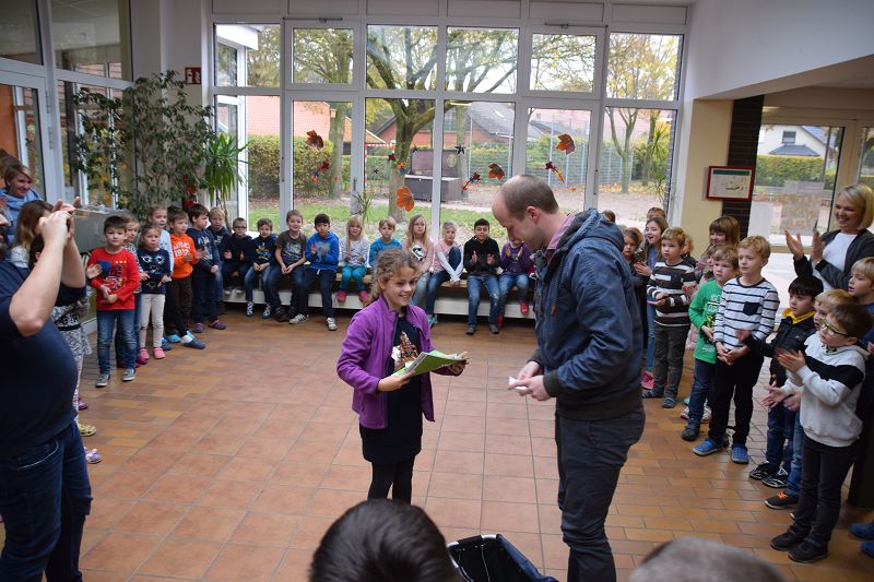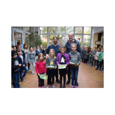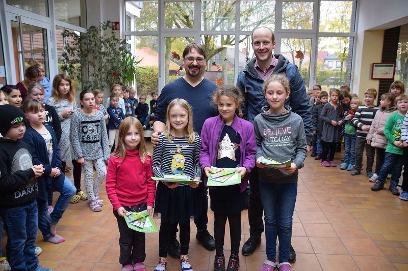 Gruppenfoto der vier Gewinnerinnen Lea Tellmann, Hanna Hermann, Lea Marie Becker, Elisa Schlangen (Grundschule Scharrel)