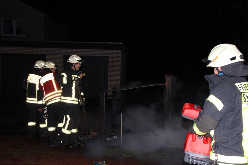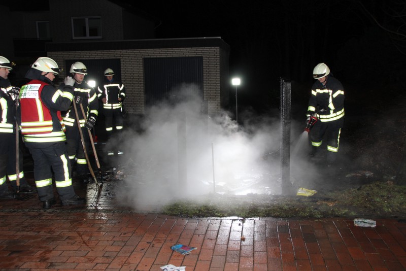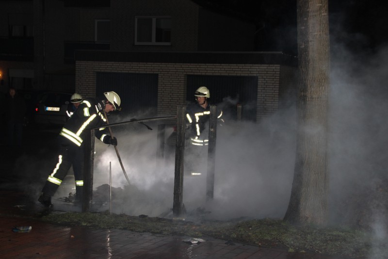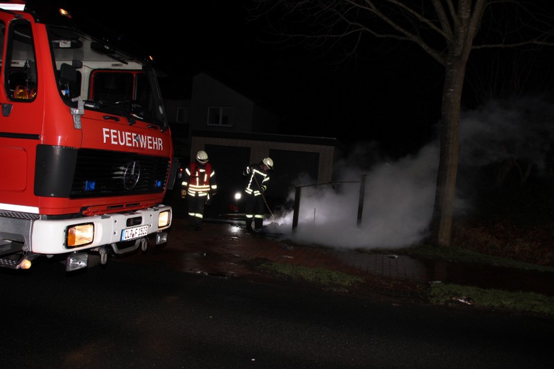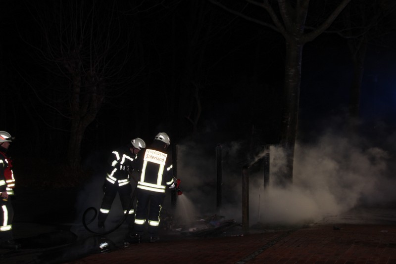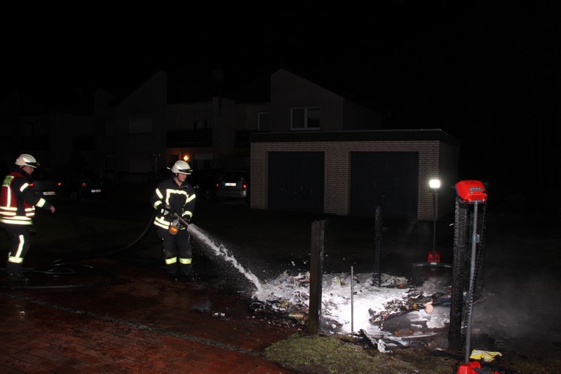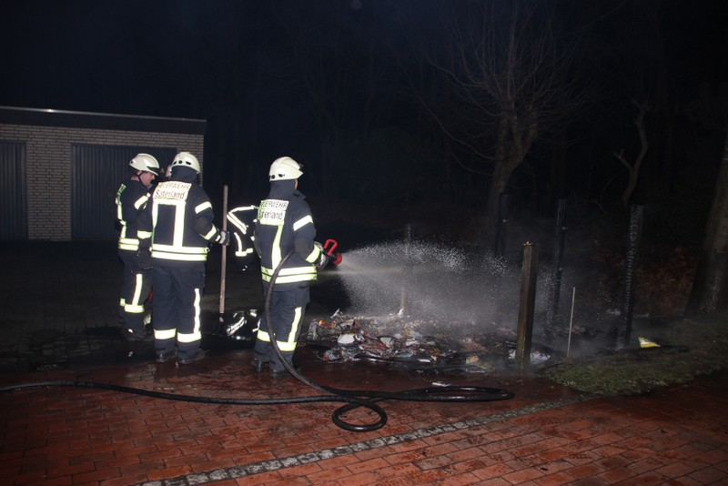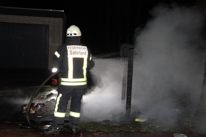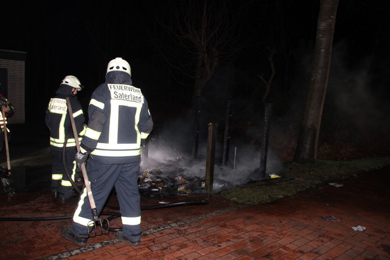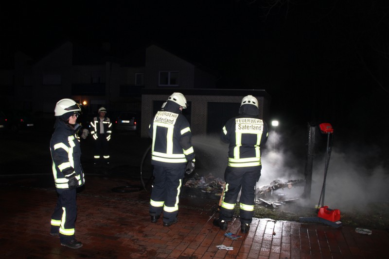 Zu einem Mülltonnenbrand an der Hauptstraße in Scharrel wurde die Feuerwehr Scharrel am Donnerstag gegen 02:10 Uhr gerufen. Beim Eintreffen der Wehr standen schon 5 Mülltonnen die unter einem Holzunterstand gelagert wurden in Vollbrand. Der Unterstand stand ca. 15m von einem Mehrfamilienhaus entfernt, durch das schnelle Eingreifen der Wehr wurde Schlimmeres verhindert. Wie die Tonnen in Brand geraten sind, ist noch unklar. Die Feuerwehr Scharrel war mit vier Fahrzeugen und 25 Kameraden vor Ort.
