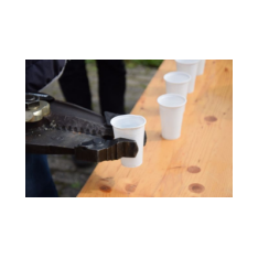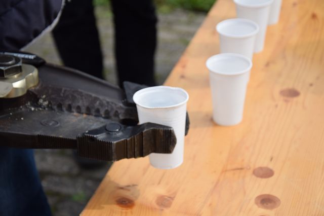 3. Mit einem Spreizer einen Becher mit Wasser tragen und in einen Eimer schütten