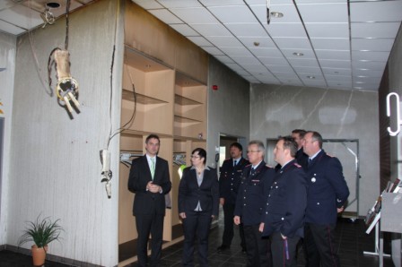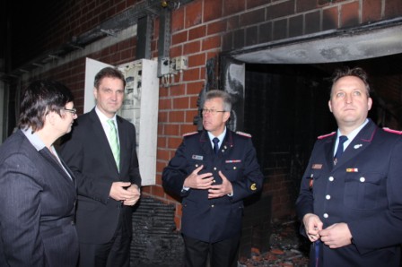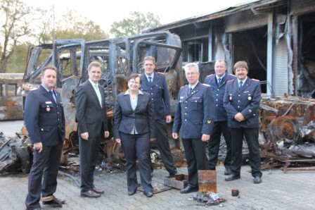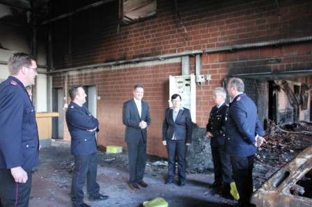 Staatssekretär Stephan Manke und MdL Renate Geuter die am Samstag zum Münsterlandtag eingeladen waren, besuchten spontan die Kameraden der Feuerwehr Scharrel. Wie berichtet wurde diese am 05.Oktober 2013 ein Opfer der Flammen. Tief betroffen schauten Sie sich mit der Führung der Saterländer Feuerwehr und dem Kreisbrandmeister Heinrich Oltmanns die Hallen und Fahrzeuge an.