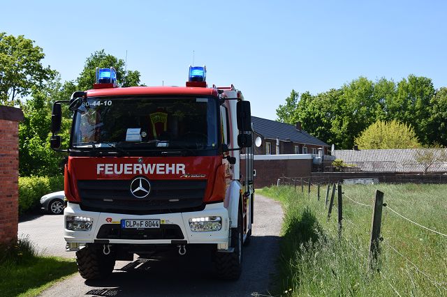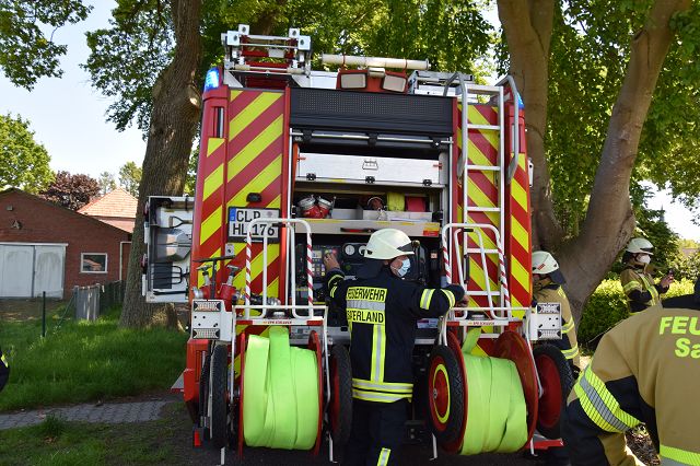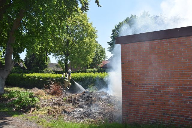 Saterland/ Scharrel – Am Montag, den 31.05.2021 wurde die Feuerwehr Scharrel gegen 13:58 Uhr zu einem Brandeinsatz nach Scharrel zur Straße Piepkebierich gerufen. Hinter einem Gebäude geriet aus noch unerklärlichen Gründen ein Haufen mit Strauchgut in Brand.
